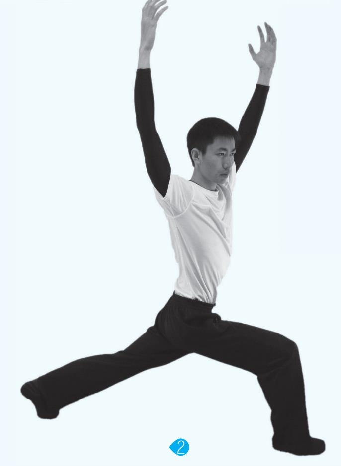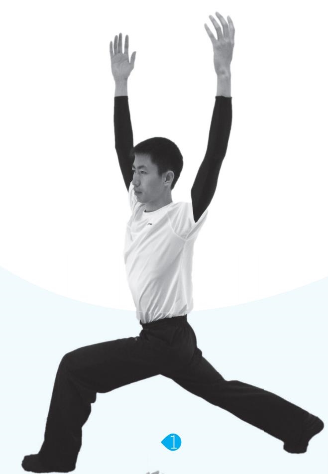 成弓步姿态,双臂头顶方向上举,上身左转,极限位置保持3~5个呼吸。