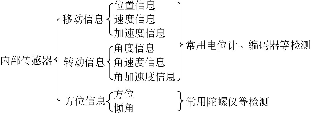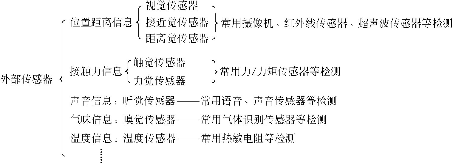 机器人传感器根据检测对象不同可分为内部传感器和外部传感器。内部传感器主要用来检测机器人自身的运动状态等相关信息,如运动时手或者腿转动的角度等。外部传感器用来检测机器人诸如位置、距离、温度、工作状况等信息。内部传感器和外部传感器的主要检测内容及种类如图3-40和图3-41所示。