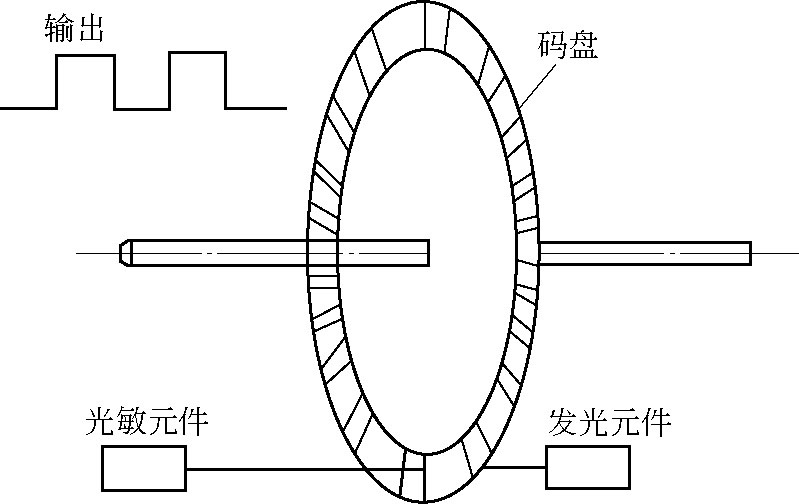 编码器的读数精度对机器人的实际控制精度有着直接影响,现对编码器的工作原理进行简要介绍,其工作原理如图3-43所示。光电式脉冲增量编码器一般由码盘、发光元件、光敏元件和信号处理电路四个部分组成。码盘安装在被测元件上,与被测元件固定。工作时,发光元件发出光信号照射在码盘上,在通过码盘的刻度时,光信号能透过码盘被光敏元件接收,从而光敏元件接收到的光信号就是被测元件的转角信息。光敏元件再把光信号转换成电信号送给识别电路,从而得到码盘的转角。再根据相邻两个电信号的时间间隔及先后顺序,即可求出码盘的转速与旋转方向。