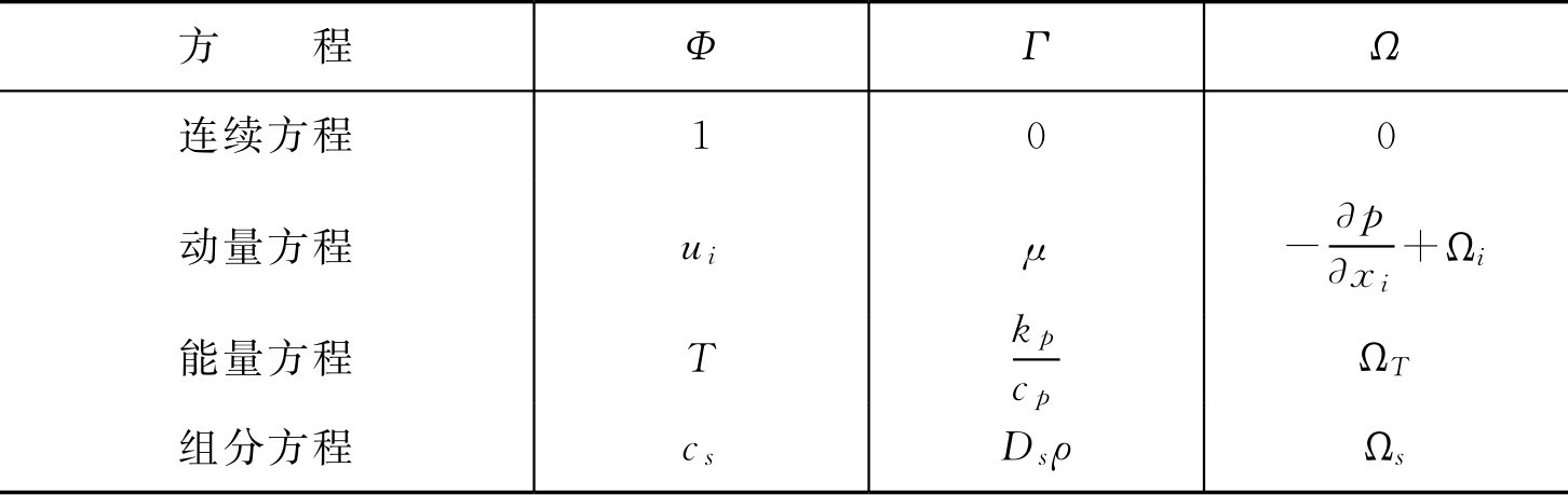Φ 为通用变量,可以表示速度矢量、温度、组分浓度等变量。公式中各项依次表示瞬态项、对流项、扩散项和源项。对于不同的控制方程, Φ 、 Γ 和 Ω 所对应的形式也有所不同,具体对应关系如表1.2所示。