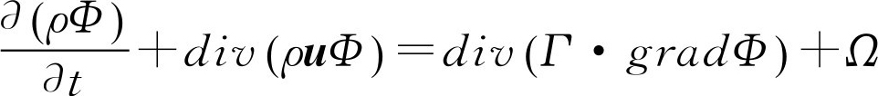 CFD是对流体流动、传热以及反应等相关现象进行分析的一种研究方法,而对流体流动与传热进行描述的基本定律包括质量守恒定律、动量守恒定律和能量守恒定律。对于含有不同成分的反应体系还应遵循组分守恒定律。以上这些守恒方程的数学描述便是控制方程组。在进行数值计算分析时,控制方程可经过适当的数学处理化为通用微分方程 [26] ,具体形式如下: