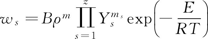 其中, w s 为 S 组分反应率,即单位时间单位体积内产生或消耗的 S 组分物质(kg/m 3 ·s), E 为活化能, R 为通用气体常数, Y s 为 S 组分质量分数, B 为指数前因子, m =∑ m s 为反应级数。为简单起见,设反应为两组分浓度起支配作用的二级反应,其反应率为: