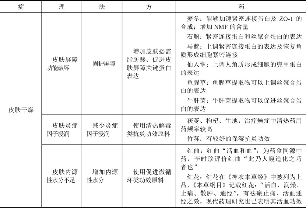 对皮肤干燥机理进行分析后,形成预防皮肤干燥的“法”,从而根据预防皮肤干燥的指导方法,形成预防皮肤干燥的具体方案:固护屏障——增加皮肤必需脂肪酸、促进皮肤屏障关键蛋白表达;减少炎症因子浸润——使用清热解毒类抗炎功效植物原料;增加内源性水分——使用活血化瘀类功效植物原料,通过促进微循环进而促进内源性水分的生成。