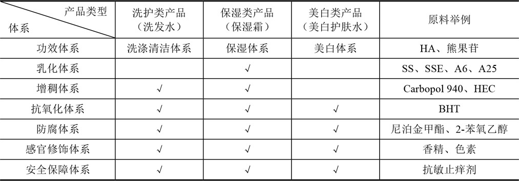 对于不同剂型和特点的产品,要求的模块有所不同。膏霜和乳液要求七个模块皆要考虑,而水剂体系要求考虑其中五个模块即可。化妆品产品与模块及原料对应表见表2-4。现对化妆品配方设计原则进行简要介绍,详细介绍见第三章。