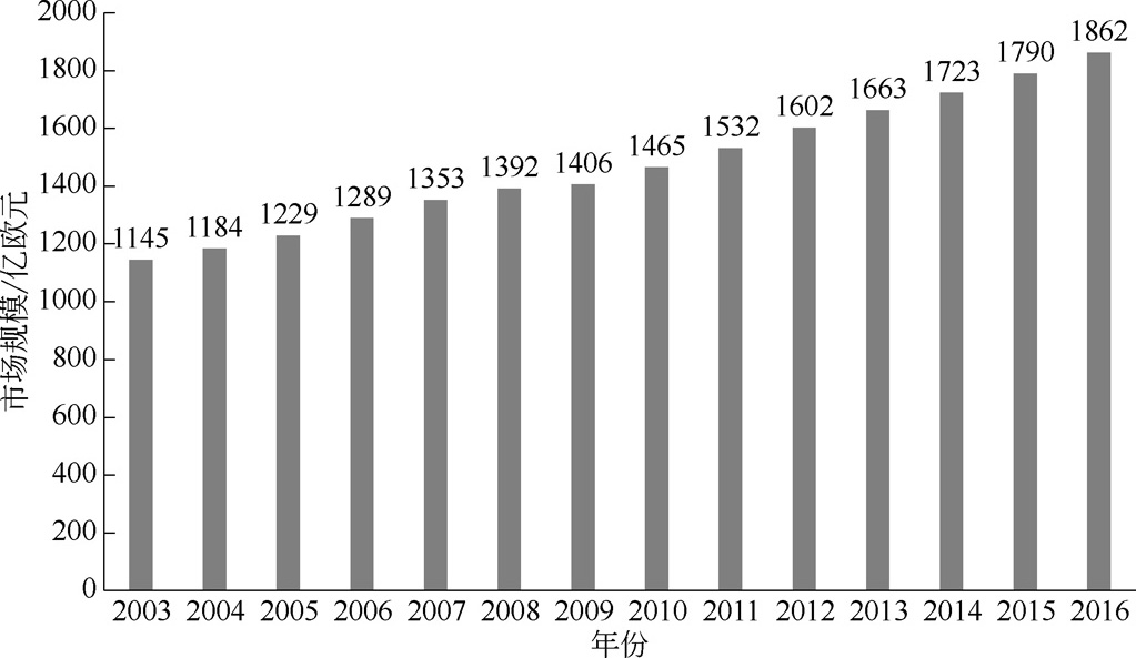 2010~2016年,全球化妆市场呈现一种坚韧而稳定的增长,未有一年出现过停滞或负增长情形,销售规模增长率基本保持在4%左右,前景乐观,详见图1-1(数据来源:欧莱雅,The world of beauty in 2016)。2014~2016年,全球化妆品消费市场中,亚太市场占比最大,西欧、北美、拉美地区分列其后,其中亚太市场为增长最快的市场。此外,就世界化妆品品种结构而言,护肤品、护发品、彩妆类是需求量最大的品类,2016年,全球化妆品品类中护肤品占比36.3%、护发品占比22.9%、彩妆类占比18.2%、香水类占比12.0%,卫生用品占比10.6%。其中,彩妆市场同比增长8.4%,已连续四年成为推动整个美妆市场发展的中坚力量。口红类产品同比增长13.6%,增幅惊人(数据来源:欧莱雅,The world of beauty in 2016)。总的来说,亚太地区依然是化妆品市场消费的领先者,得益于该地区人口众多、消费者可支配收入日益增加以及完善的零售和分销网络。在化妆品品类中,彩妆以及口红市场消费增长迅速,成为最受消费者喜爱的化妆品品类。
