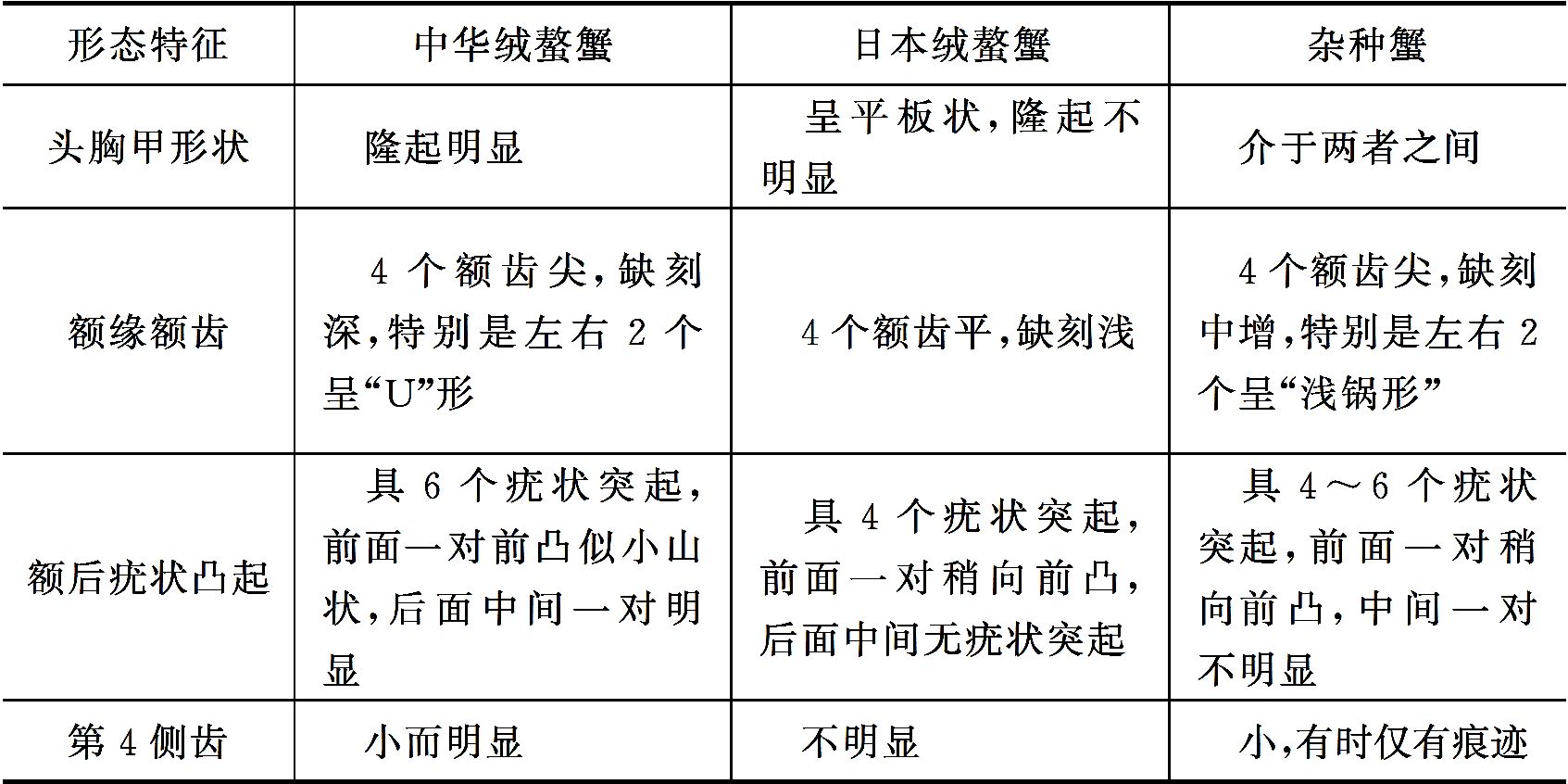 表1-1 中华绒螯蟹与日本绒螯蟹及杂种蟹形态比较