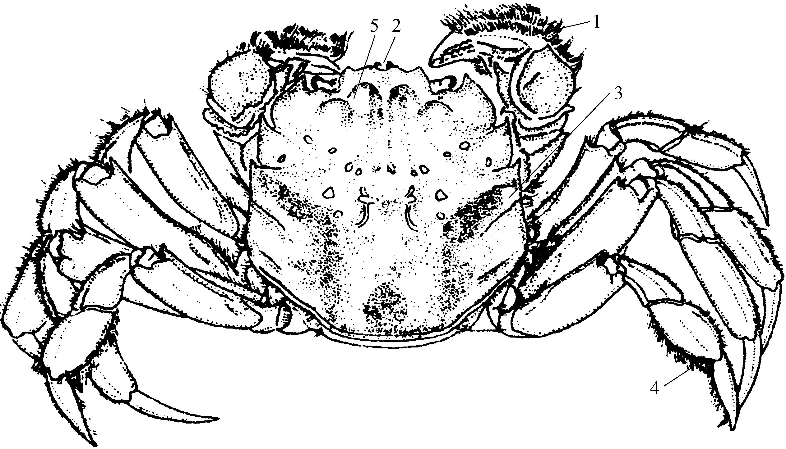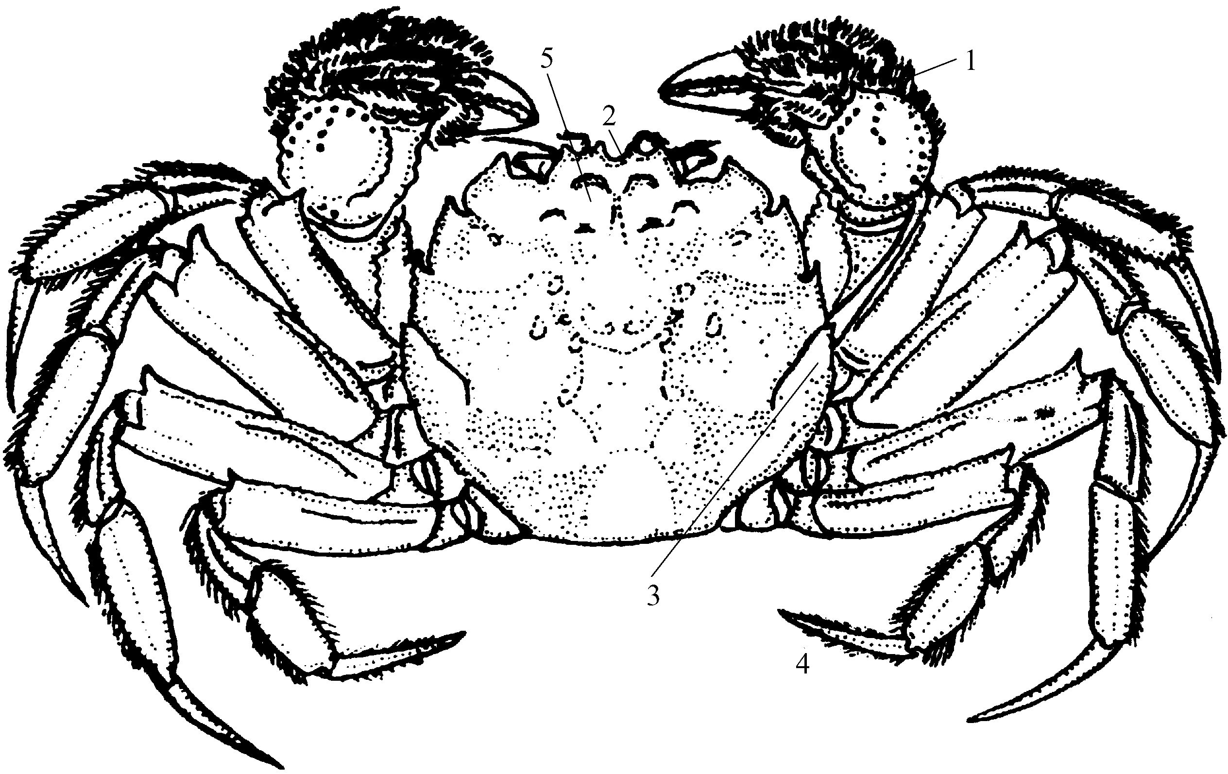 河蟹是我国特产,其学名为中华绒螯蟹( Eriocheir sinensis ),俗称毛蟹、螃蟹、清水蟹、大闸蟹、胜芳蟹,又根据其行为特征与身体结构而被称为“横行将军”或“无肠公子”。河蟹在分类上属于节肢动物门、甲壳纲、软甲亚纲、十足目、爬行亚目、方蟹科、绒螯蟹属。绒螯蟹属有4个种,即中华绒螯蟹(图1-1)、日本绒螯蟹(图1-2)、直额绒螯蟹、狭额绒螯蟹。中华绒螯蟹和日本绒螯蟹个体大,养殖产量高,具有较高的经济价值;直额绒螯蟹、狭额绒螯蟹个体小,经济价值不大,但直额绒螯蟹具有春季洄游大海生殖的习性,在此时捕捞能调剂蟹市,满足市场需求。如台湾,每年5月份有性腺成熟的黄满膏肥的直额绒螯蟹上市,价高畅销。所以当地有人说:“没有大闸蟹,小蟹能称王”。中华绒螯蟹(图1-3)与日本绒螯蟹(图1-4)外表相似,但在头胸甲形状、额缘额齿形状、第4侧齿、额后疣状凸起数量等方面有显著差异。不同水系的河蟹种群杂交,形成杂种蟹,其形态特征介于两者之间(图1-5、表1-1)。