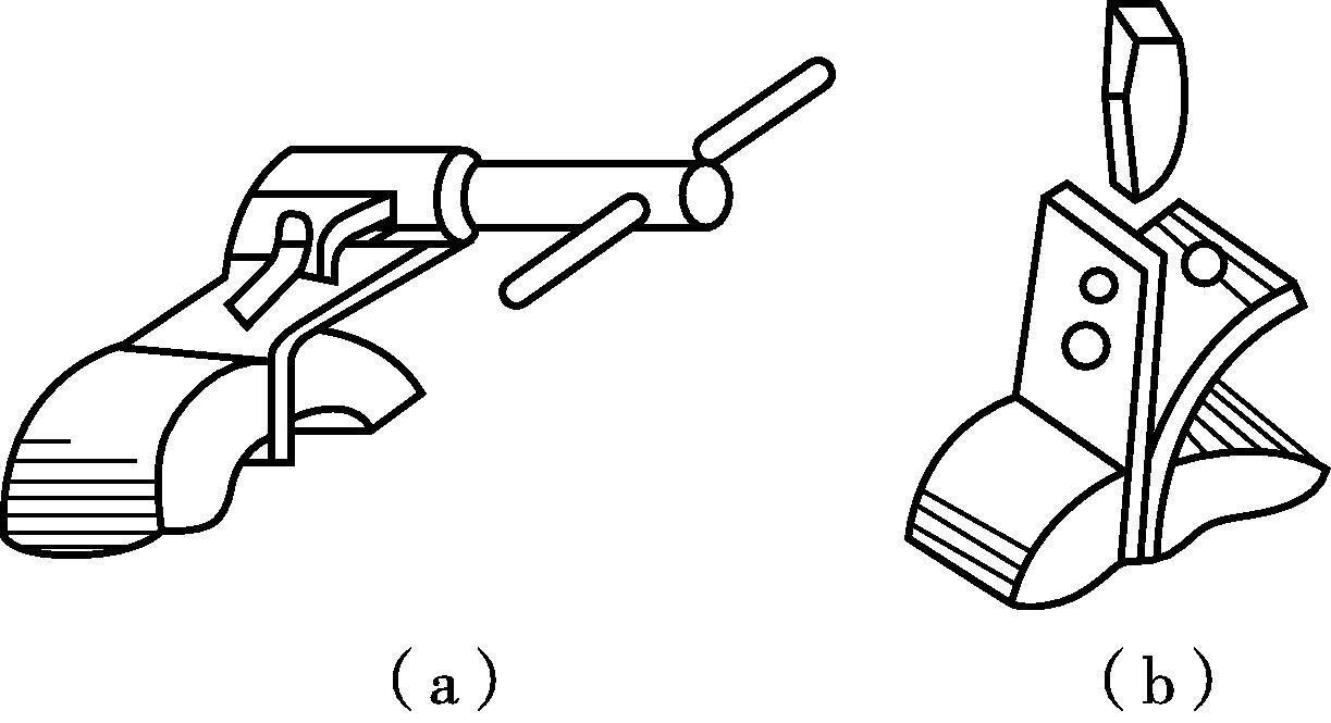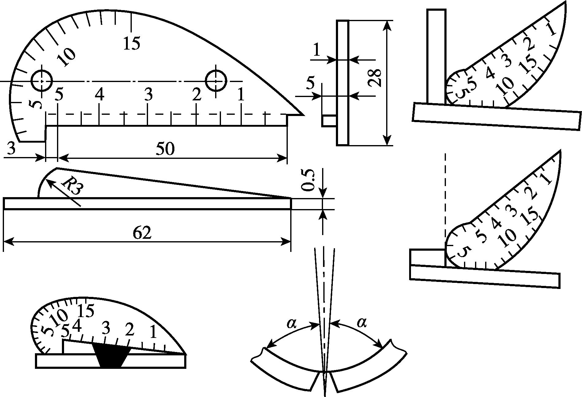 焊缝外形尺寸检验时,被检验的焊接接头应清理干净,不应有焊接熔渣和其他覆盖层。在测量焊缝外形尺寸时,可采用标准样板和量规。样板组和焊缝的测量如图2-2所示,检查焊缝用的量规如图2-3所示,万能量规的用法如图2-4所示。