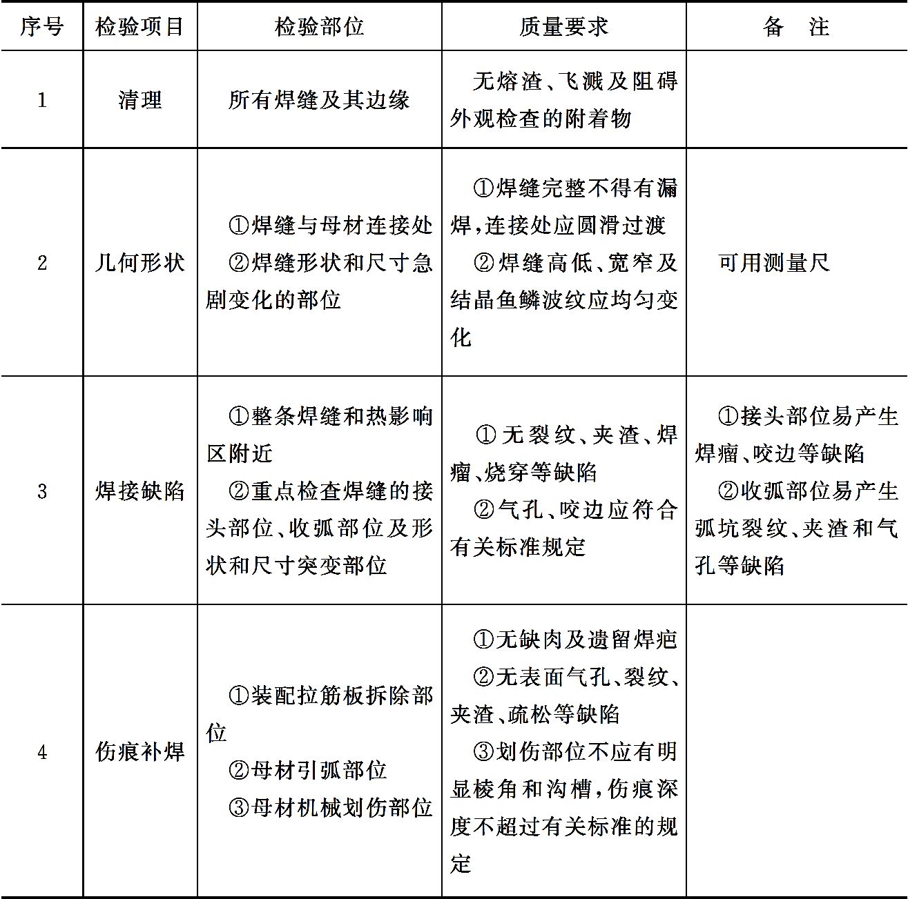 焊接工作结束后,要及时清理焊渣和飞溅,然后按表2-1的项目进行检验。