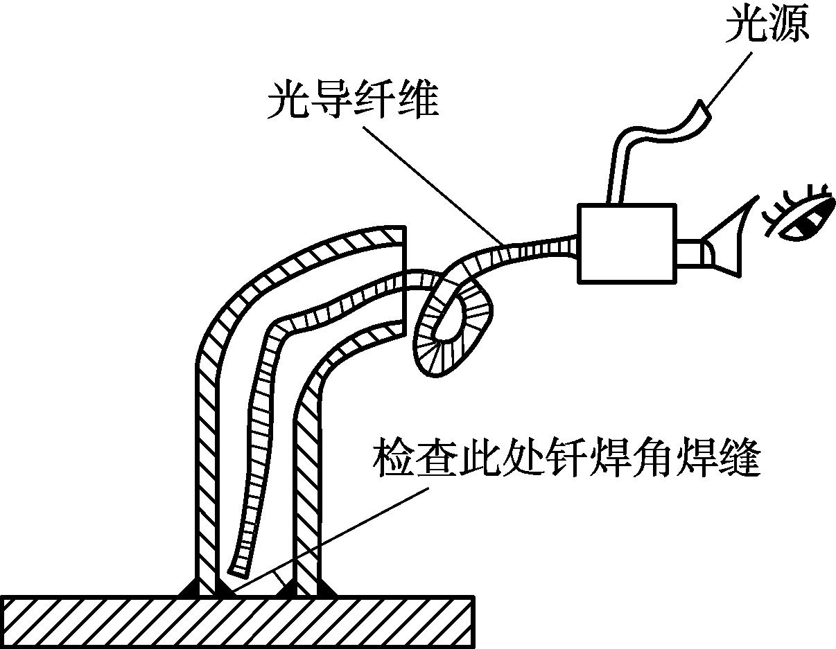 d.内窥镜检查。主要用于弯曲或遮挡部位表面钎缝的检查(见图2-7)。必要时可采用3~10倍放大镜进行观察。