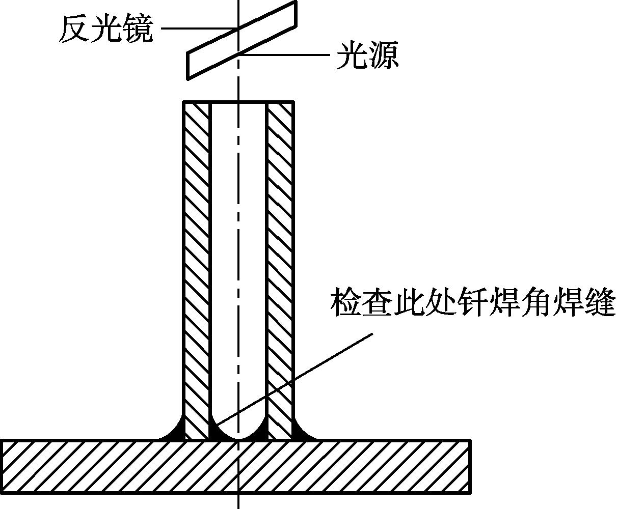 c.反光镜检查。适用于深孔、盲孔等不能直接目视的场合(见图2-6)。必要时可采用3~10倍放大镜进行目视观察。