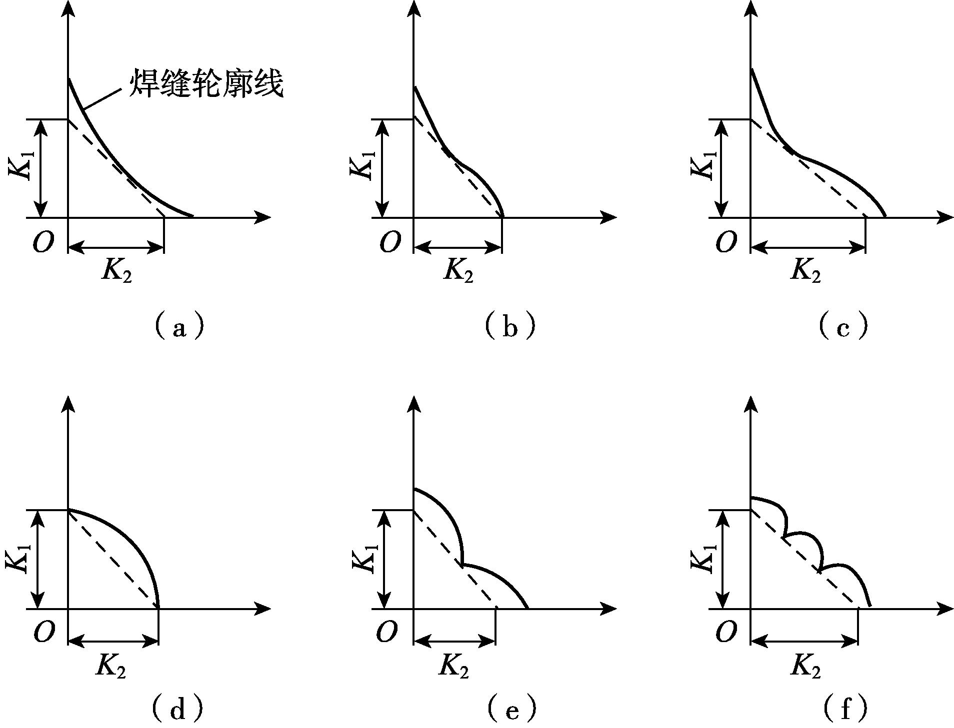 角焊缝外形尺寸包括焊脚、焊脚尺寸、凹凸度和焊缝边缘直线度等。大多数情况下,焊缝计算厚度不能进行实测,需要通过焊脚尺寸进行计算。焊角尺寸 K 1 、 K 2 的确定如图2-5所示。