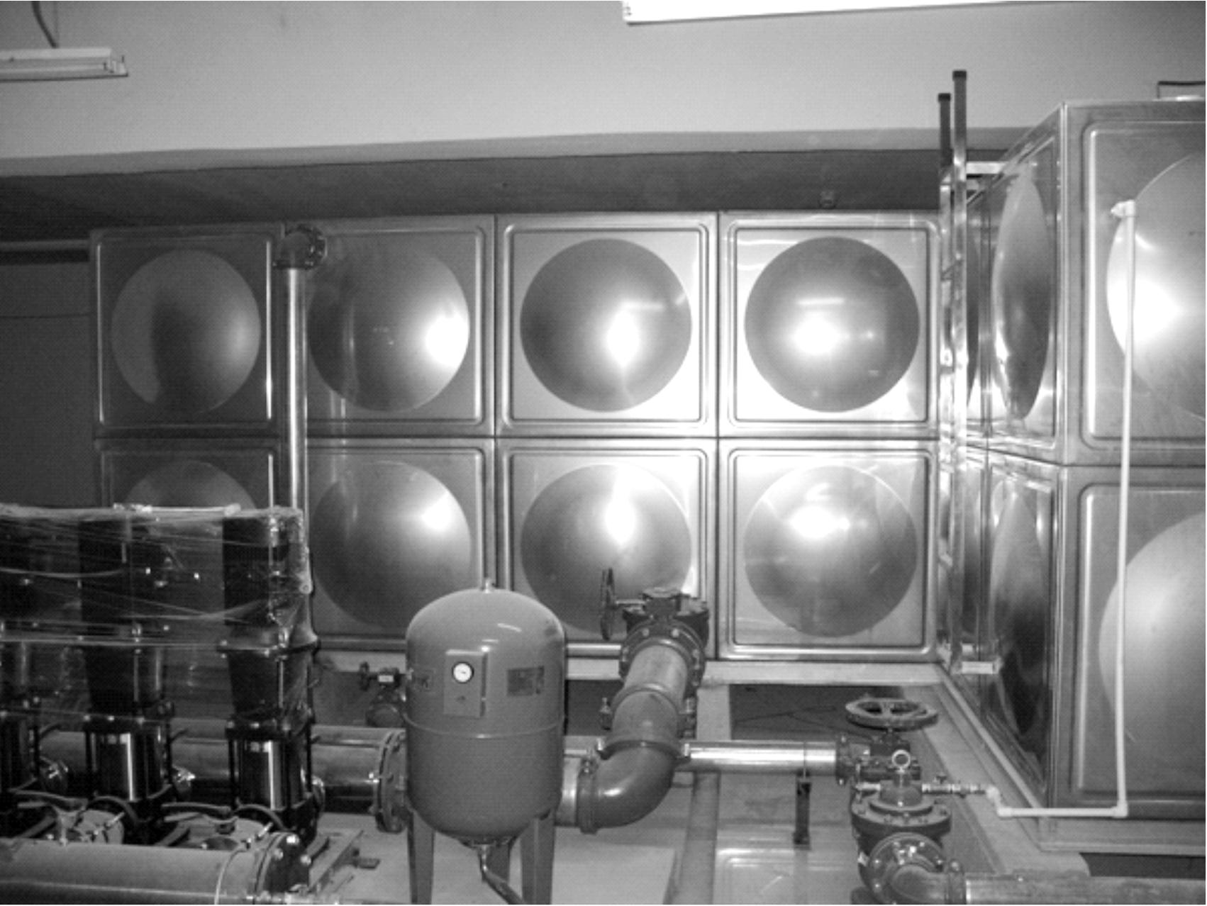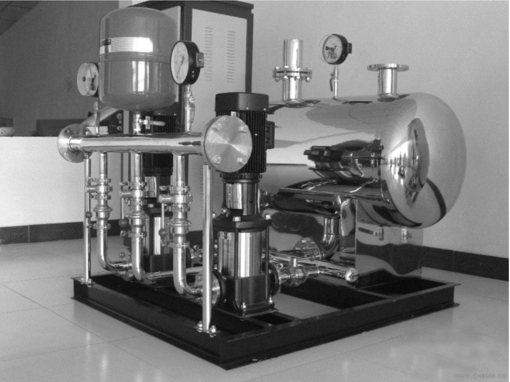 负压变频供水设备能根据供水管网中瞬时变化的压力和流量参数,自动改变水泵的台数和电机运行转速,实现恒压变量供水的目的(图2-4)。水泵的功率随用水量变化而变化,用水量大,水泵功率自动增大;用水量小,水泵功率自动减小,能节电50%,从而达到高效节能的目的。