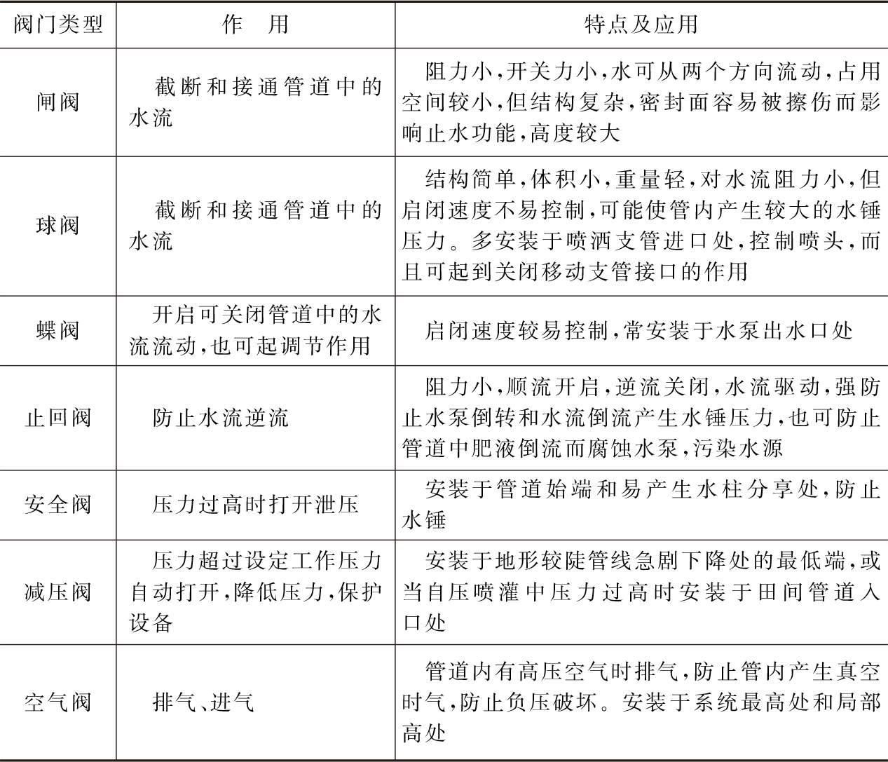 阀门是喷灌系统必用的部件,主要有闸阀、蝶阀、球阀、截止阀、止回阀、安全阀、减压阀等(图2-17~图2-19)。在同一灌溉系统中,不同的阀门起着不同的作用,使用时可根据实际情况选用不同类型的阀门,表2-4列出了各类阀门的作用及特点,在选择时供参考。