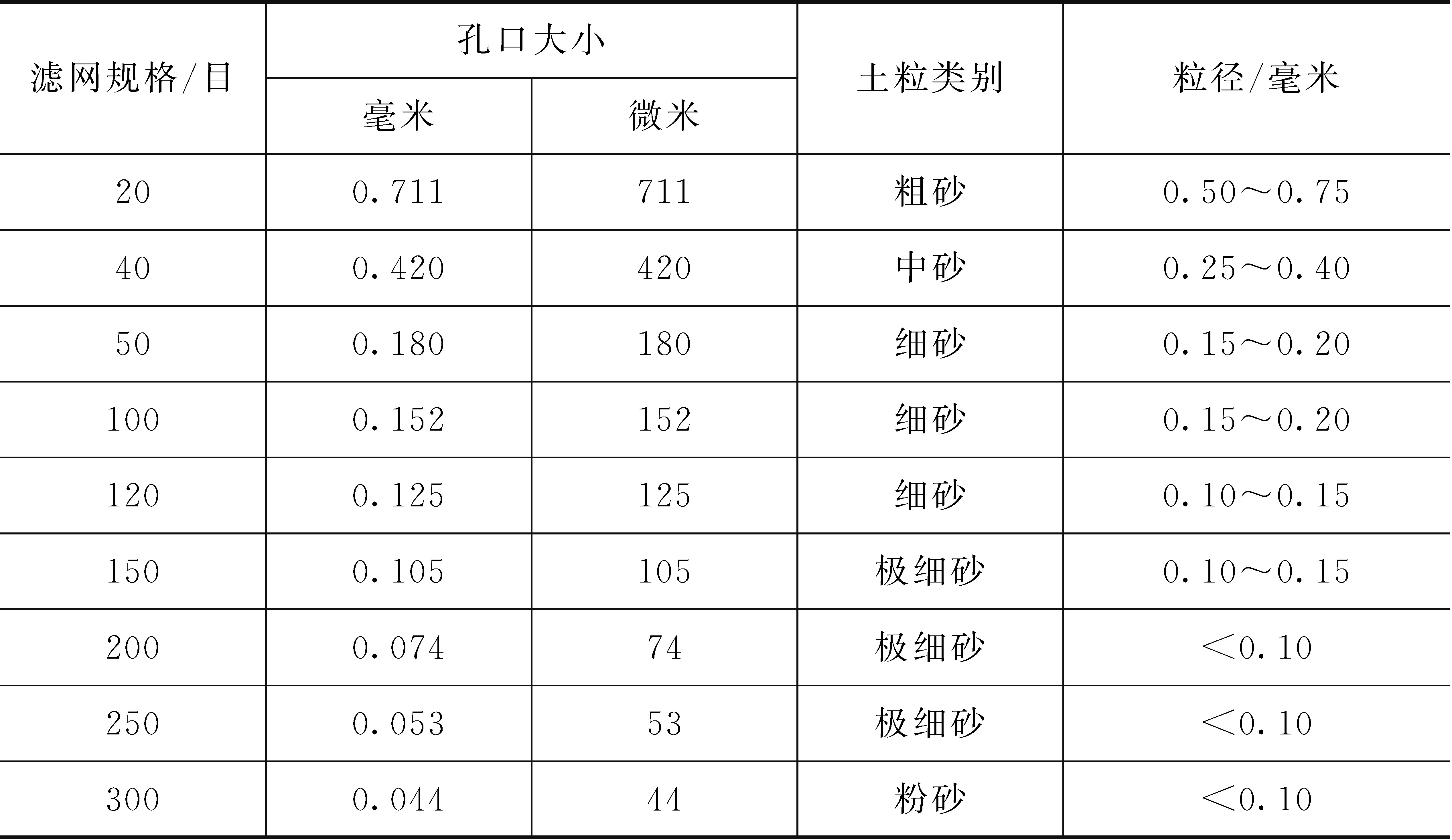 ③结构。筛网过滤器主要由筛网、壳体、顶盖等部分组成(图2-23)。筛网的孔径大小(即网目数)决定了过滤器的过滤能力。由于通过过滤器筛网的污物颗粒会在灌水器的孔口或流道内相互挤在一起而堵塞灌水器,因而一般要求所选用的过滤器滤网的孔径大小应为所使用的灌水器孔径的1/10~1/7。筛网规格与孔口大小的关系见表2-2。
