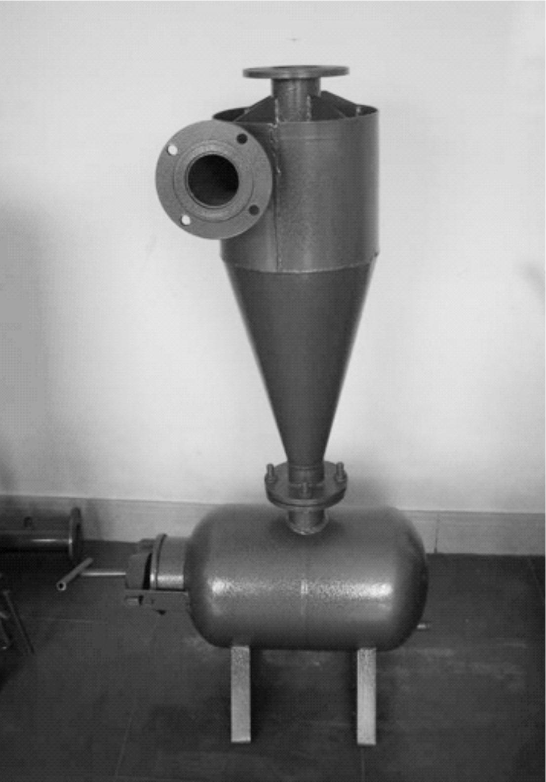 离心式过滤器因其是利用旋转水流和离心作用使水砂分离而进行过滤的,因而对高含砂水流有较理想的过滤效果,但是较难除去与水密度相近和密度比水小的杂质,因而有时也称为砂石分离器。另外在水泵启动和停机时由于系统中水流流速较小,过滤器内所产生的离心力小,其过滤效果较差,会有较多的砂粒进入系统,因而离心式过滤器一般不能单独承担微灌系统的过滤任务,必须与筛网式或叠片式过滤器结合运用,以水砂分离器作为初级过滤器,这样会起到较好的过滤效果,延长冲洗周期。离心式过滤器底部的储污室必须频繁冲洗,以防沉积的泥沙再次被带入系统。离心式过滤器有较大的水头损失,在选用和设计时一定要将这部分水头损失考虑在内(图2-11)。