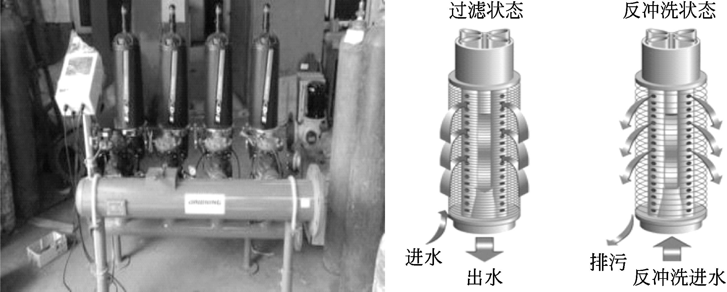 叠片式过滤器是由大量的很薄的圆形片重叠起来,并锁紧形成一个圆柱形滤芯,每个圆形叠片的两个面分布着许多滤槽,当水流经过这些叠片时,利用盘壁和滤槽来拦截杂质污物。这种类型的过滤器过滤效果要优于筛网式过滤器,其过滤能力在40~400目之间可用于初级和终级过滤,但当水源水质较差时不宜作为初级过滤,否则清洗次数过多,反而带来不便(图2-8、图2-9)。