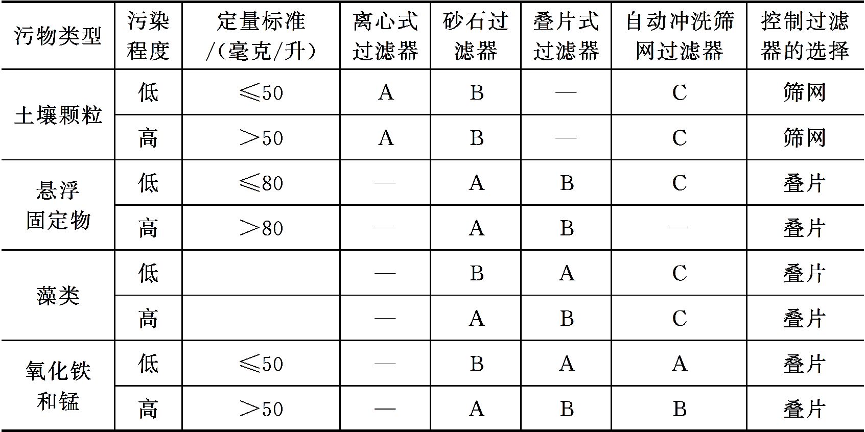 第一步,根据灌溉水杂质种类及各类杂质的含量选择过滤器类型。地面水(江河、湖泊、塘库等)一般含有较多的砂石和有机物,宜选用砂石过滤器作为一级过滤,如果杂质体积比较大,还需要用拦污栅作初级拦污过滤;如果含沙量大,还需要设置沉沙池作初级拦污过滤。地下水(井水)杂质一般以砂石为主,宜选用离心式过滤器作为一级过滤。无论是砂石过滤器还是离心式过滤器,都可以根据需要选用筛网式过滤器或叠片式过滤器作为二级过滤。对于水质较好的水源,可直接选用筛网式或叠片式过滤器。表2-3总结了不同类型过滤器对去除浇灌水中不同污物的有效性。