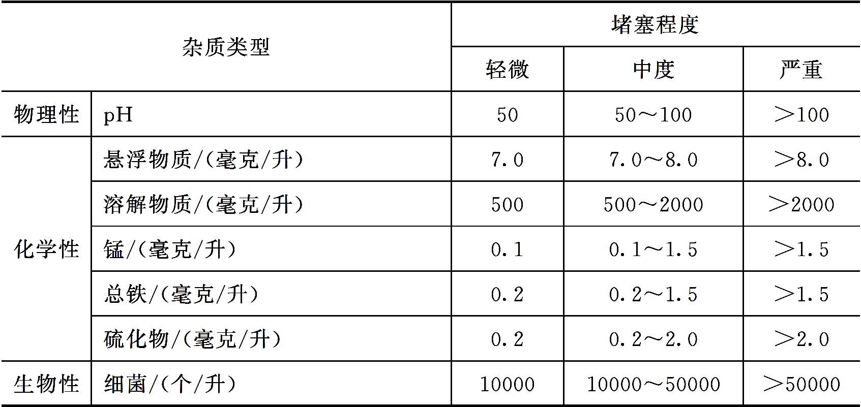 灌溉水中所含污物及杂质有物理、化学和生物三大类。物理污物及杂质是悬浮在水中的有机或无机的颗粒(有机物质主要有死的水藻、鱼、枝叶等动植物残体等,无机杂质主要是黏粒和沙粒)。化学污物及杂质是指溶于水中的某些化学物质,在条件改变时会变成不溶的固体沉淀物,堵塞灌水器。生物污物及杂质主要包括活的菌类、藻类等微生物和水生动物等,它们进入系统后可能繁殖生长,减小过水断面,堵塞系统。表2-1表明了水中所含杂质情况与滴头堵塞程度有关。