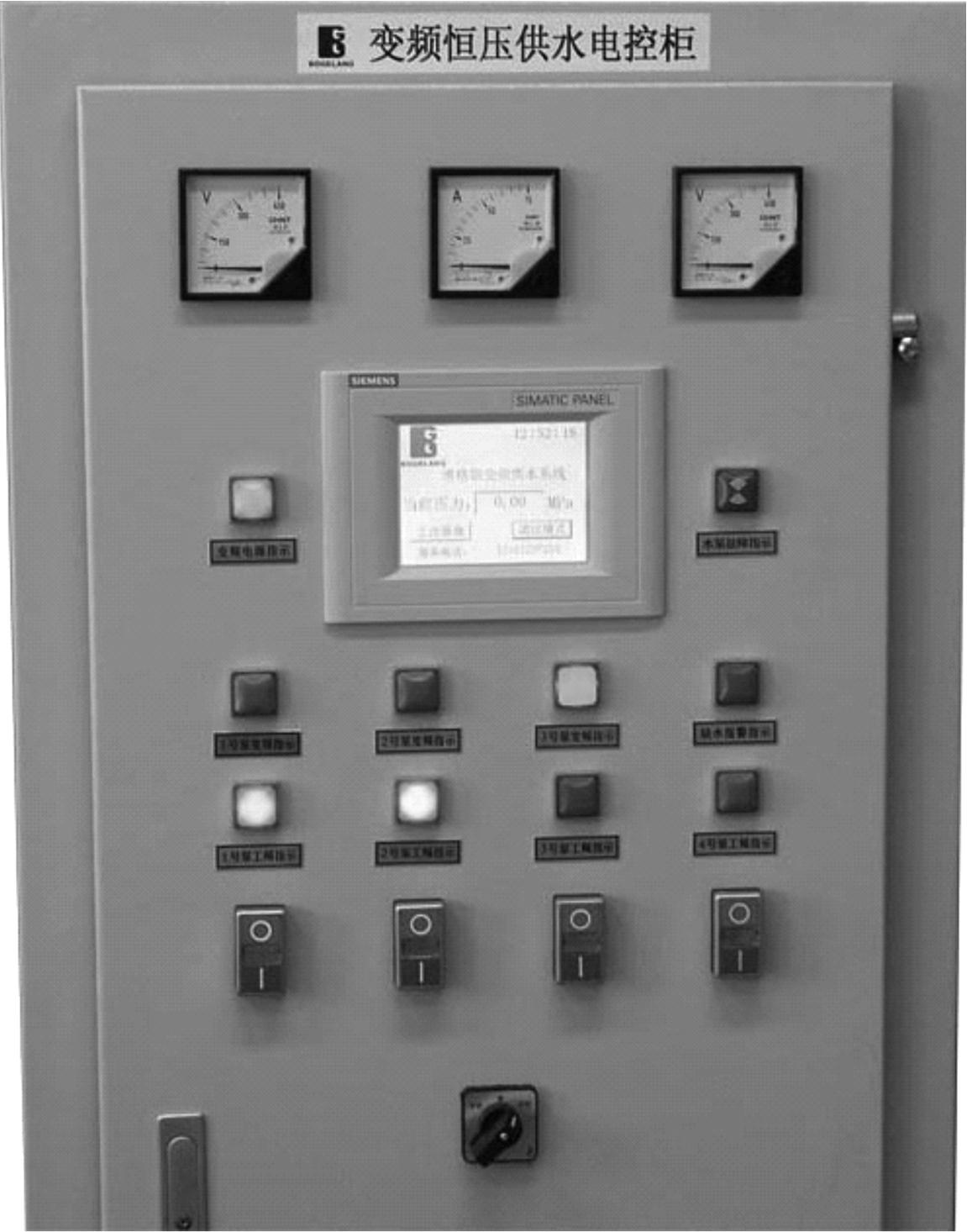 变频恒(变)压供水设备控制柜,是对供水系统中的泵组进行闭环控制的机电一体化成套设备(图2-6)。该设备采用工业微机可变程序控制器和数字变频调整技术,根据供水系统中瞬时变化的流量和相应的压力,自动调节水泵的转速和运行台数,从而改变水泵出口压力和流量,使供水管网系统中的压力按设定压力保持恒定,达到提高供水品质和高效节能的目的。