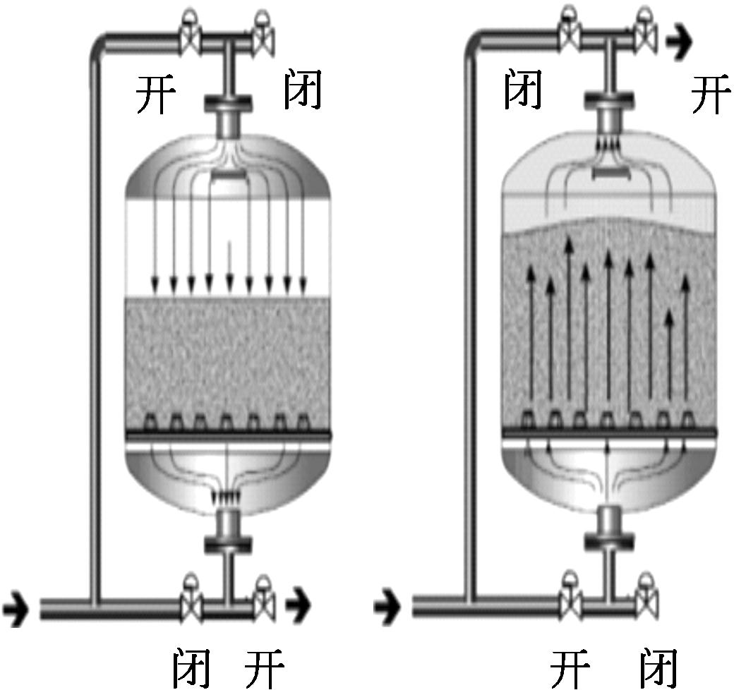 砂石过滤器主要由进水口、出水口、过滤器壳体、过滤介质砂砾和排污孔等部分组成,其形式见图2-12。其工作原理是当水由进水口进入过滤器并经过砂石过滤床时,因过滤介质间的孔隙曲折而又小,水流受阻流速减小,水源中所含杂质就会被阻挡而沉淀或附着到过滤介质表面,从而起到过滤作用,经过滤后的干净水从出水口进入灌溉管道系统。当过滤器两端压力差超过30~50千帕时,说明过滤介质被污物堵塞严重,需要进行反冲洗。反冲洗是通过过滤器控制阀门,使水流产生逆向流动,将以前过滤阻拦下来的污物通过排污口排出。为了使灌溉系统在反冲洗过程中也能同时向系统供水,常在首部枢纽安装两个以上过滤器,其工作过程如图2-13。