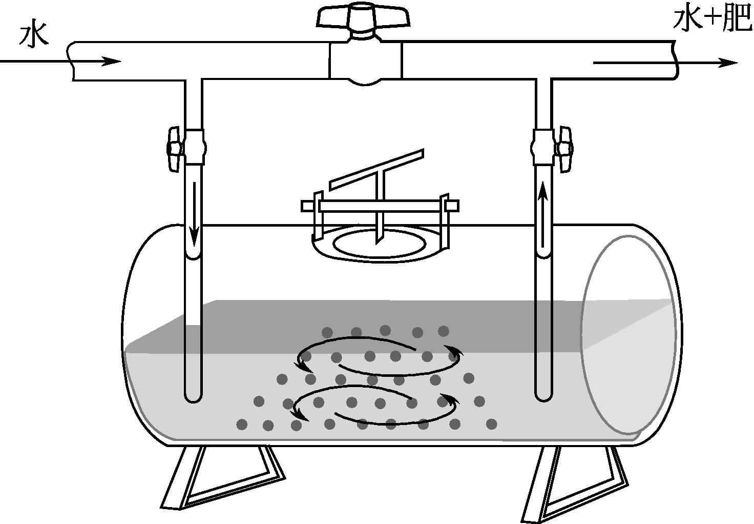 肥料罐是用抗腐蚀的陶瓷衬底或镀锌铸铁、不锈钢或纤维玻璃做成,以确保经得住系统的工作压力和抗肥料腐蚀。在低压滴灌系统中,由于压力低(约10米水压),也可用塑料罐,固体可溶肥料在肥料罐里逐渐溶解,液体肥料则与水快速混合。随灌溉进行,肥料不断被带走,肥料溶液不断被稀释,养分越来越低,最后肥料罐里的固体肥料都流走了(图2-29)。该系统较简单、便宜,不需要用外部动力就可以达到较高的稀释倍数。然而,该系统也存在一些缺陷,如无法精确控制灌溉水中的肥料注入速率和养分浓度,每次灌溉之前都得重新将肥料装入施肥罐内。节流阀增加了压力的损失,而且该系统不能用于自动化操作。肥料罐常做成10~300升的规格。一般温室果树大棚小面积地块用体积小的施肥罐,露地果树轮灌区面积较大的地块用体积大的施肥罐。