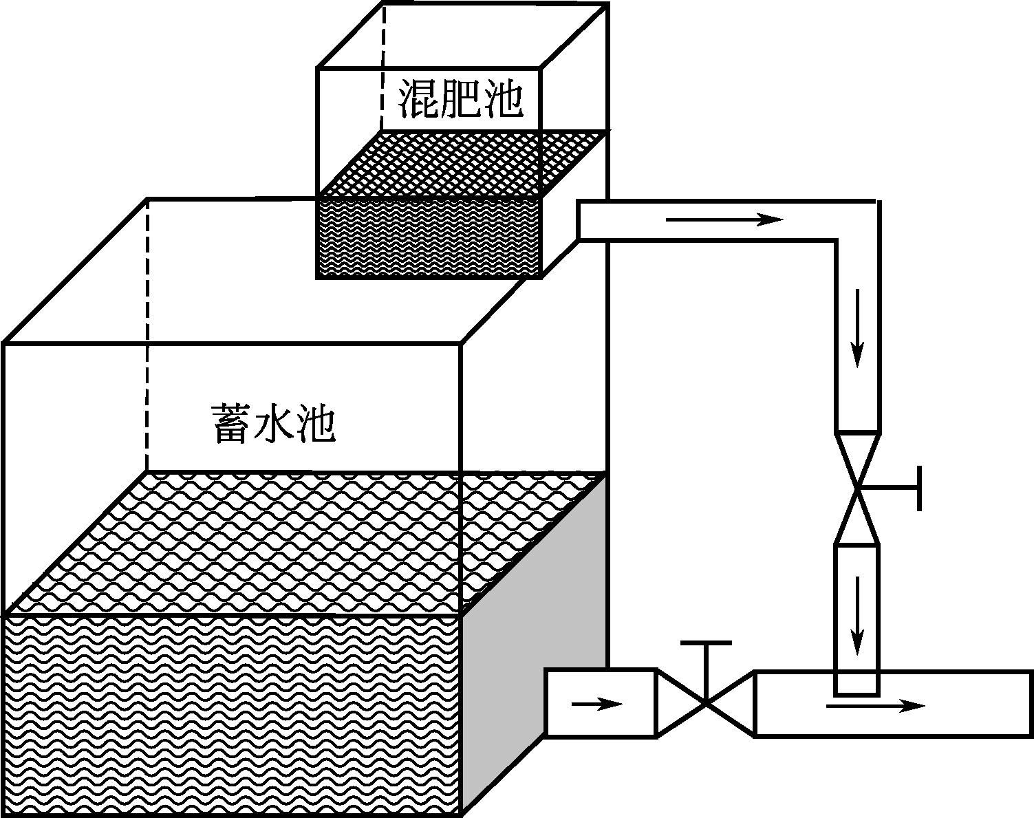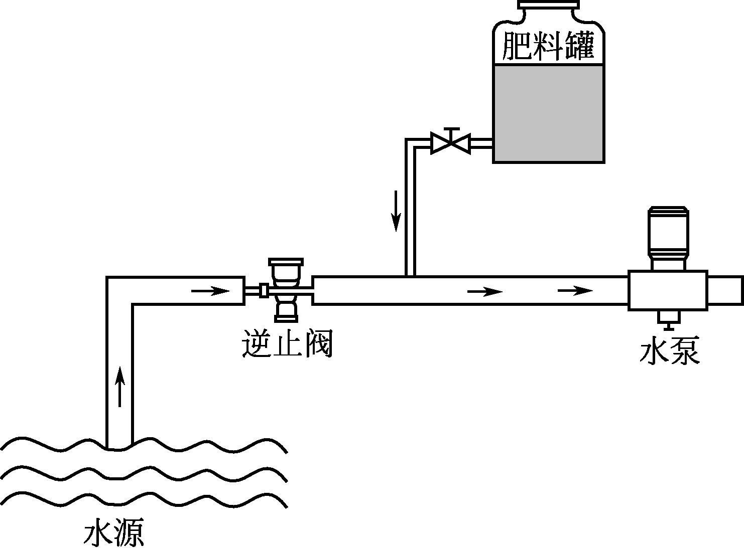 泵吸肥法是利用离心泵直接将肥料溶液吸入灌溉系统,适合于几十公顷以内面积的施肥。为防止肥料溶液倒流入水池而污染水源,可在吸水管上安装逆止阀。通常在吸肥管的入口包上100~120目滤网(不锈钢或尼龙),防止杂质进入管道。该法的优点是不需外加动力,结构简单,操作方便,可用敞口容器盛肥料溶液。施肥时通过调节肥液管上阀门,可以控制施肥速度,精确调节施肥浓度。缺点是施肥时要有人照看,当肥液快完时应立即关闭吸肥管上的阀门,否则会吸入空气,影响泵的运行(图2-39)。