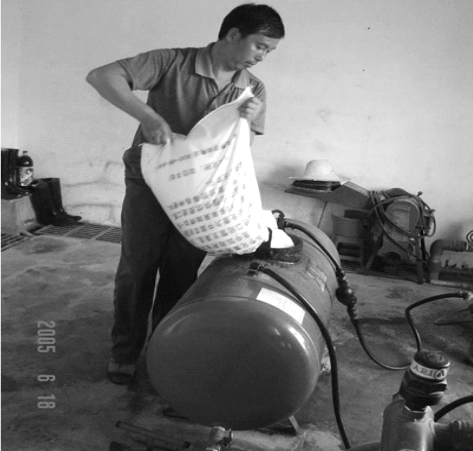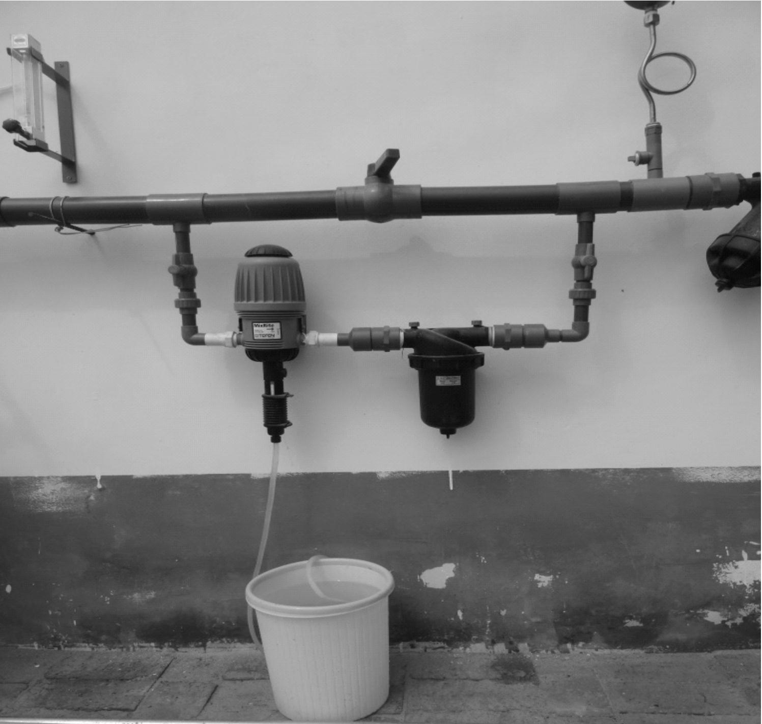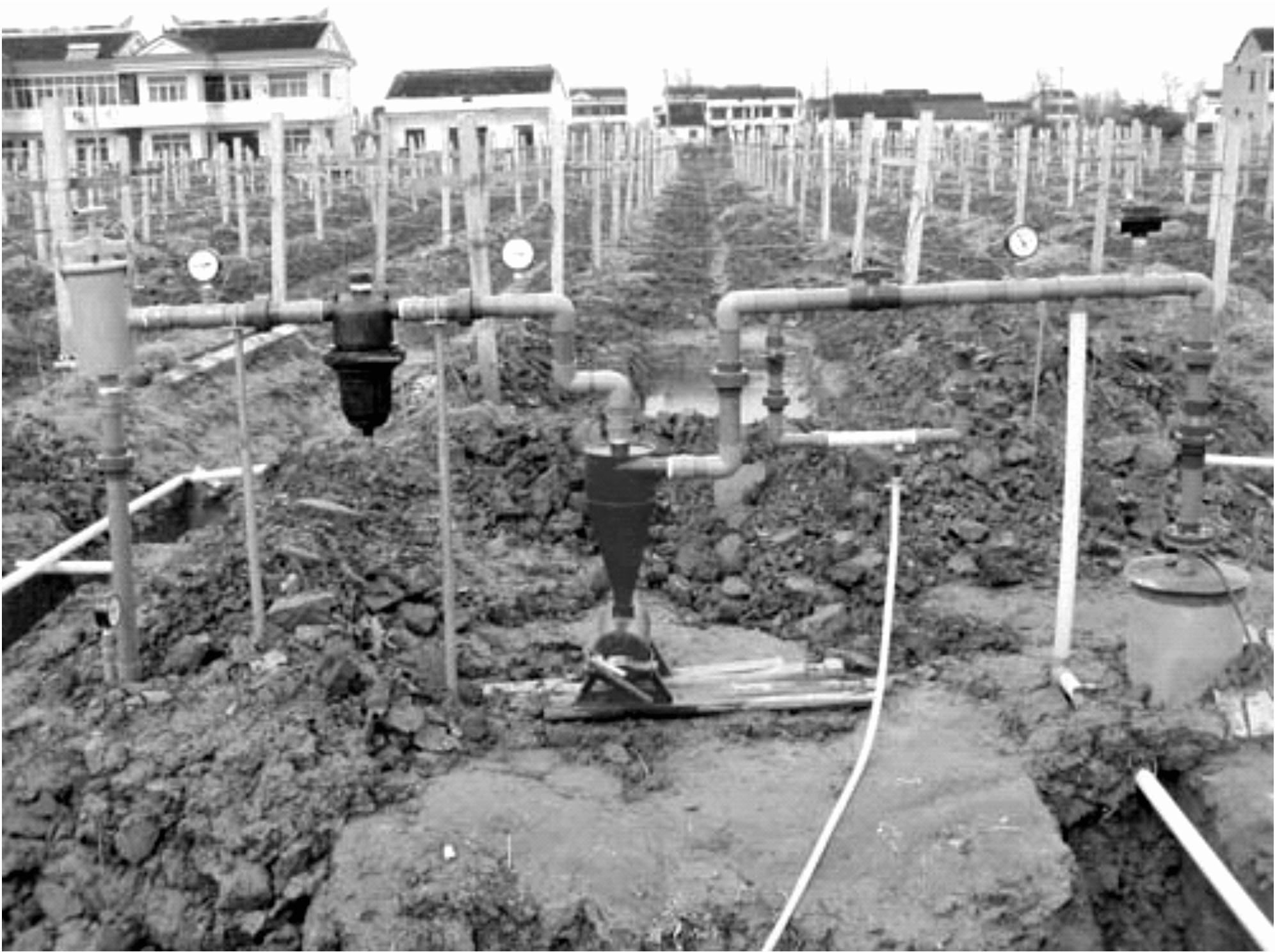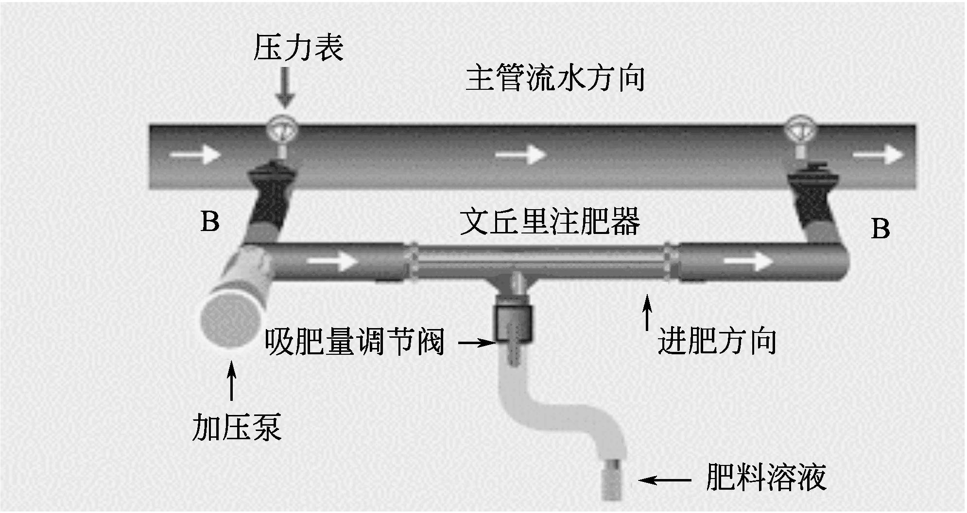 泵注肥法是利用加压泵将肥料溶液注入有压管道,通常泵产生的压力必须要大于输水管的水压,否则肥料注不进去。对用深井泵或潜水泵抽水直接灌溉的地区,泵注肥法是最佳选择(图2-40)。泵施肥法施肥速度可以调节,施肥浓度均匀,操作方便,不消耗系统压力。不足是要单独配置施肥泵。对施肥不频繁地区,普通清水泵可以使用,施完肥后用清水清洗,一般不生锈。但对于频繁施肥的地区,建议用耐腐蚀的化工泵。