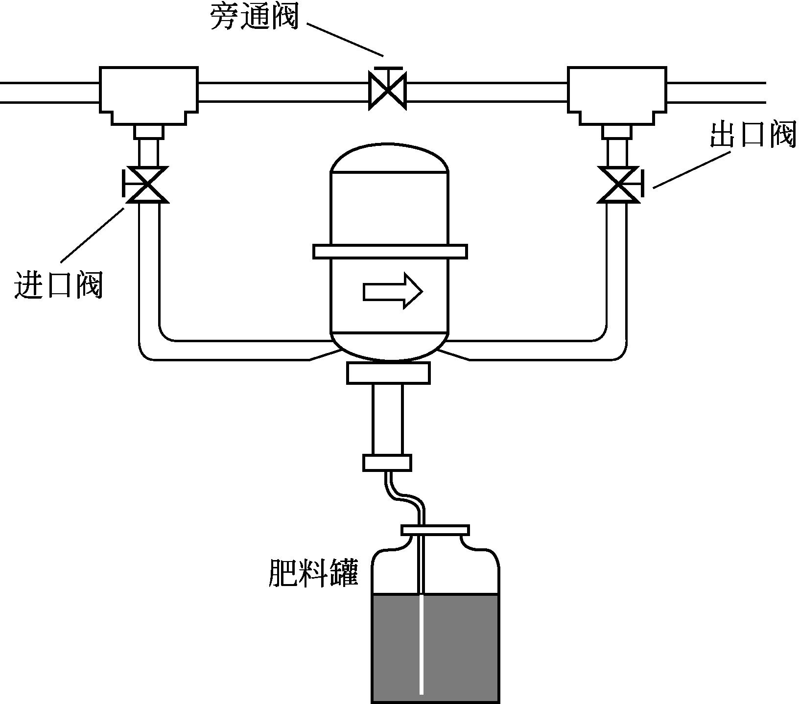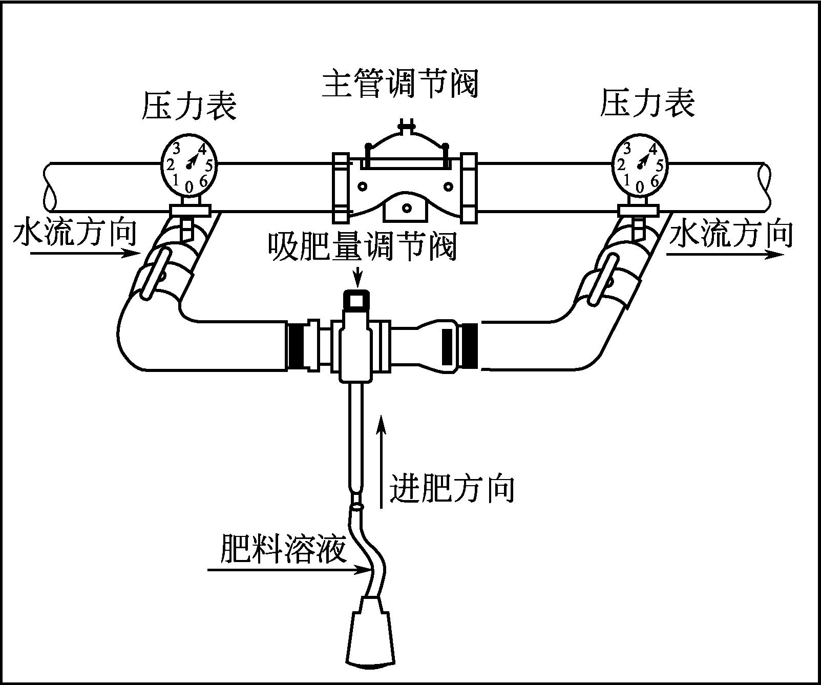 在大多数情况下,文丘里施肥器安装在旁通管上(并联安装),这样只需部分流量经过射流段。当然,主管道内必须产生与射流管内相等的压力降。这种旁通运行可使用较小(较便宜)的文丘里施肥器,而且更便于移动。当不加肥时,系统也工作正常。当施肥面积很小且不考虑压力损耗时,也可用串联安装。