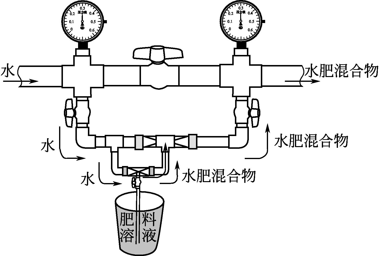 文丘里施肥器的操作需要有过量的压力来保证必要的压力损耗;施肥器入口稳定的压力是养分浓度均匀的保证。压力损耗量用占入口处压力的百分数来表示,吸力产生需要损耗入口压力的20%以上,但是两级文丘里施肥器只需损耗10%的压力。吸肥量受入口压力、压力损耗和吸管直径影响,可通过控制阀和调节器来调整。文丘里施肥器可安装于主管路上(串联安装,图2-33)或者作为管路的旁通件安装(并联安装,图2-34)。在温室里,作为旁通件安装的施肥器其水流由一个辅助水泵加压。