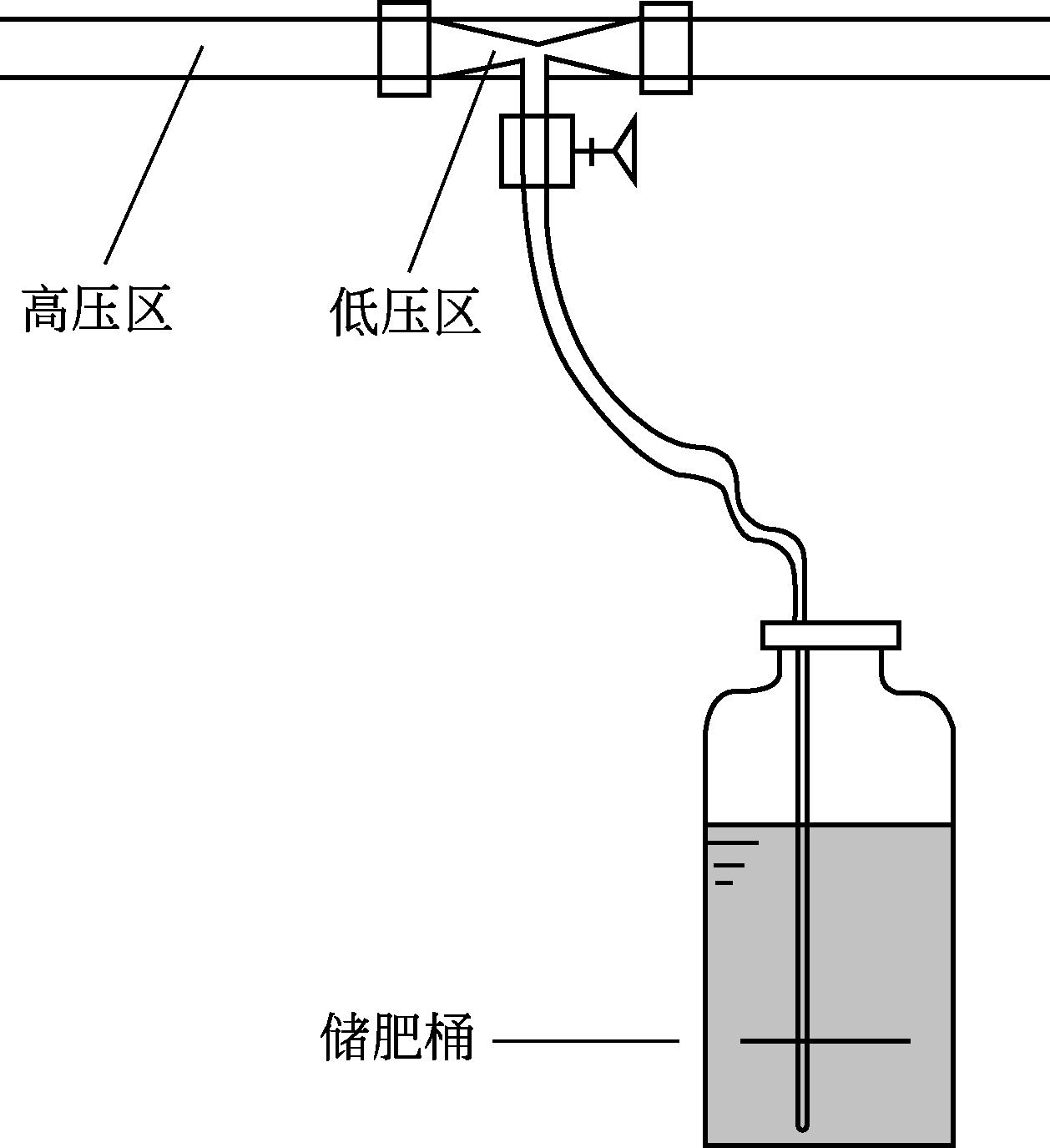 水流通过一个由大渐小然后由小渐大的管道时(文丘里管喉部),水流经狭窄部分时流速加大,压力下降,使前后形成压力差,当喉部有一更小管径的入口时,形成负压,将肥料溶液从一敞口肥料罐通过小管径细管吸取上来。文丘里施肥器即根据这一原理制成(图2-30、图2-31)。文丘里施肥器用抗腐蚀材料制作,如塑料和不锈钢,现绝大部分为塑料制造。文丘里施肥器的注入速度取决于产生负压的大小(即所损耗的压力)。损耗的压力受施肥器类型和操作条件的影响,损耗量为原始压力的10%~75%。表2-5列出了压力损耗与吸肥量(注入速度)的关系。