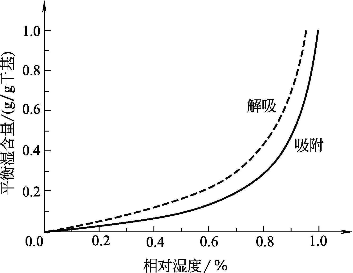(2)干燥特性 对于某种特定的物料,对平衡湿含量值和与其对应的保存环境相对湿度值作图,就得该物料在特定温度下的吸附或解吸等温线。物料在干空气状态下,逐步增加环境湿度作出的等温线称为吸附等温线;在饱和湿空气条件下,逐步降低环境湿度作出的等温线称为解吸等温线。