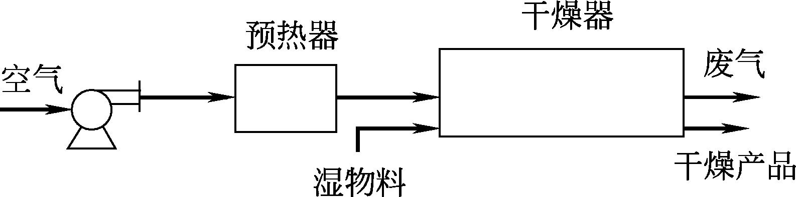 对流干燥流程如图3-3所示,空气经风机送入预热器,加热到一定温度后送入干燥器与湿物料直接接触,进行传质、传热,最后废气自干燥器另一端排出。