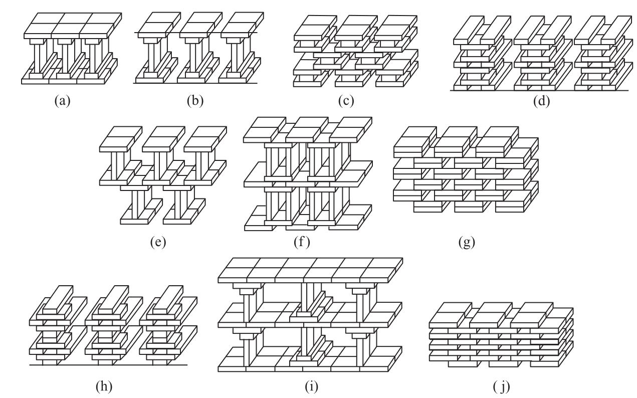 (a)双座单条连续式;(b)双座单条间断式;(c)空十字形;;(d)梅花形;(e)单座单条式 (f)单座双条式;(g)双砖方块形;(h)陀螺形;(i)柱脚柱帽式;(j)单砖方块形