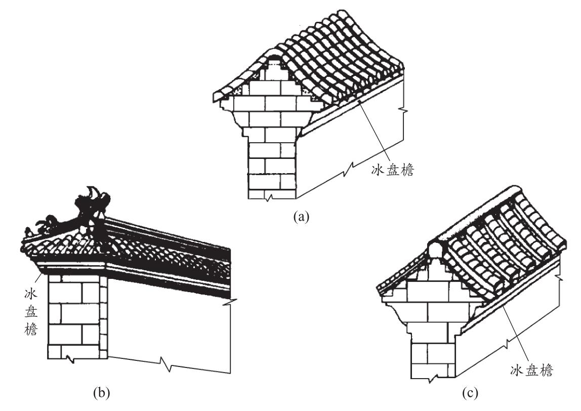 (a)简瓦墙帽;(b)正垂脊琉璃墙顶合;(c)瓦墙帽