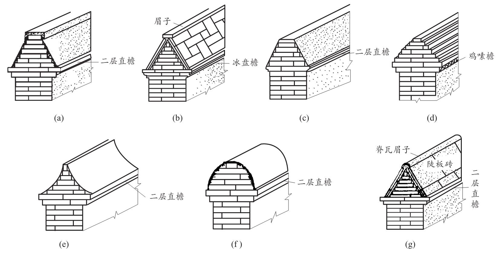它是采用屋脊顶盖形式的一种墙帽,分为过垄脊筒瓦顶、正垂脊琉璃瓦顶、鞍子脊或皮条脊合瓦顶,如图3-38所示。