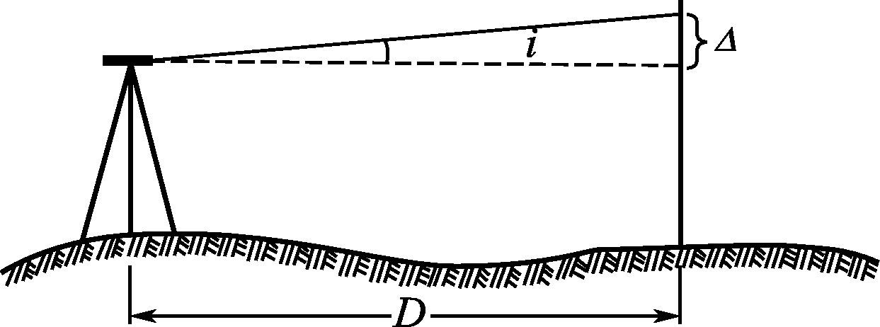 由图2-28知,设水准管的分划值为20″,如果气泡偏离半格(即 i =10″),则当距离为50m时, Δ =2.4mm;当距离为100m时, Δ =4.8mm;误差随距离的增大而增大。因此,在读数前,必须使附合水准气泡精确吻合。