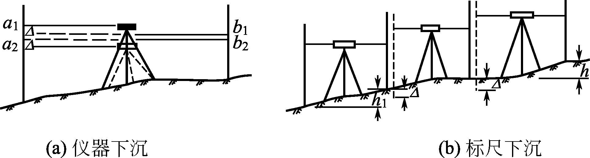 如图2-29所示,在水准测量时,仪器、水准尺的重量和土壤的弹性会使仪器及尺垫下沉或上升,导致读数减小或增大而引起观测误差。