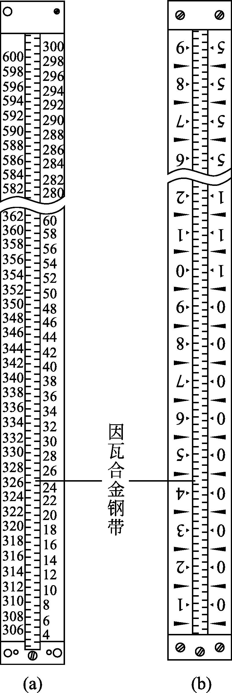 图2-36(a)为徕卡公司生产的精密水准标尺,主要为徕卡新N3精密水准仪配套使用。因为新N3精密水准仪为正像望远镜,所以水准标尺的注记也是正立的。尺长约3.2m,在因瓦合金钢带上右边的一排分划为基本分划,数字注记从0~300cm,左边的一排分划为辅助分划,数字注记从300~600cm,基本分划与辅助分划的零点相差301.55cm,称为基辅差或尺常数,用于作业时检查读数是否存在粗差。