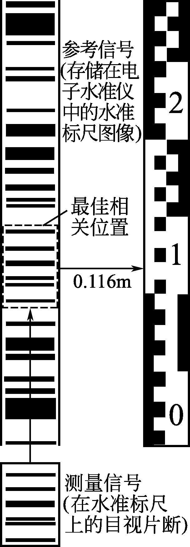 由于标尺到仪器的距离不同,条码在探测器上成像的宽窄也不相同,即图2-45中片段条码的宽窄会变化,随之电信号的“宽窄”也将改变,于是引起上述相关的困难。NA系列仪器采用二维相关法来解决,也就是根据精度要求以一定步距改变仪器内部参考信号的“宽窄”,与探测器采集到的测量信号相比较,如果没有相同的两信号,则再改变,再进行一维相关,直至两信号相同为止,可以确定读数。参考信号的“宽窄”与视距是对应的,“宽窄”相同的两信号相比较是求视线高的过程,因此二维相关中,一维是视距,另一维是视线高。二维相关之后视距就可以精确算出。