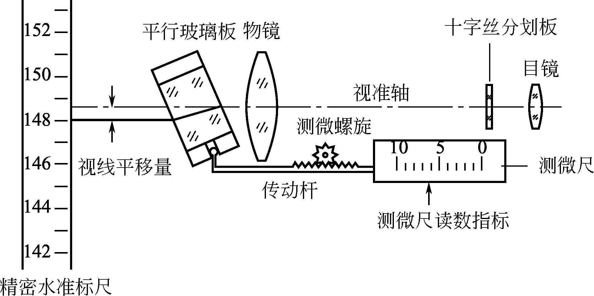 (3)高精度的测微器装置 精密水准仪必须有光学测微器装置,以测定小于水准标尺最小分划线间隔值的尾数,光学测微器可直读0.1mm,估读到0.01mm。
