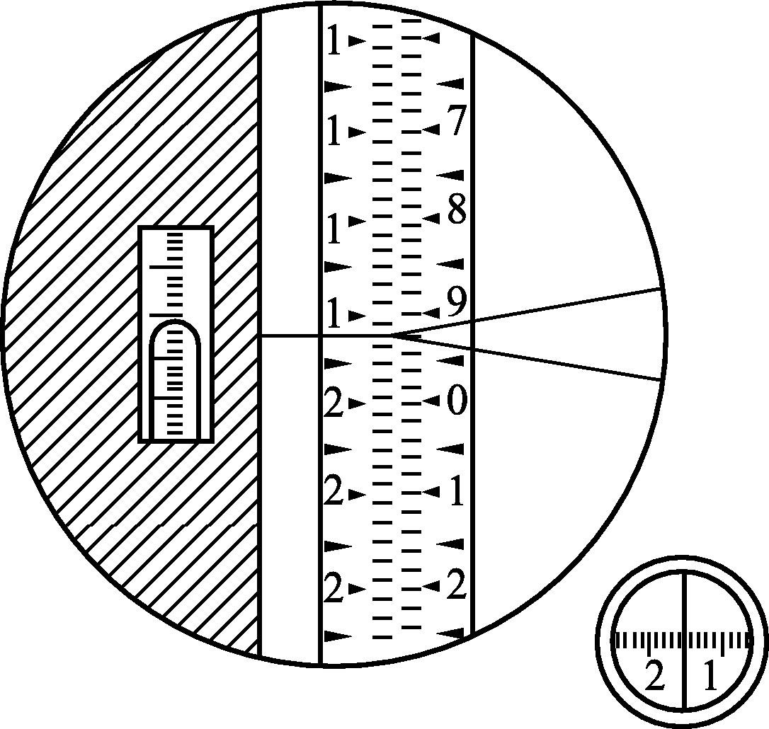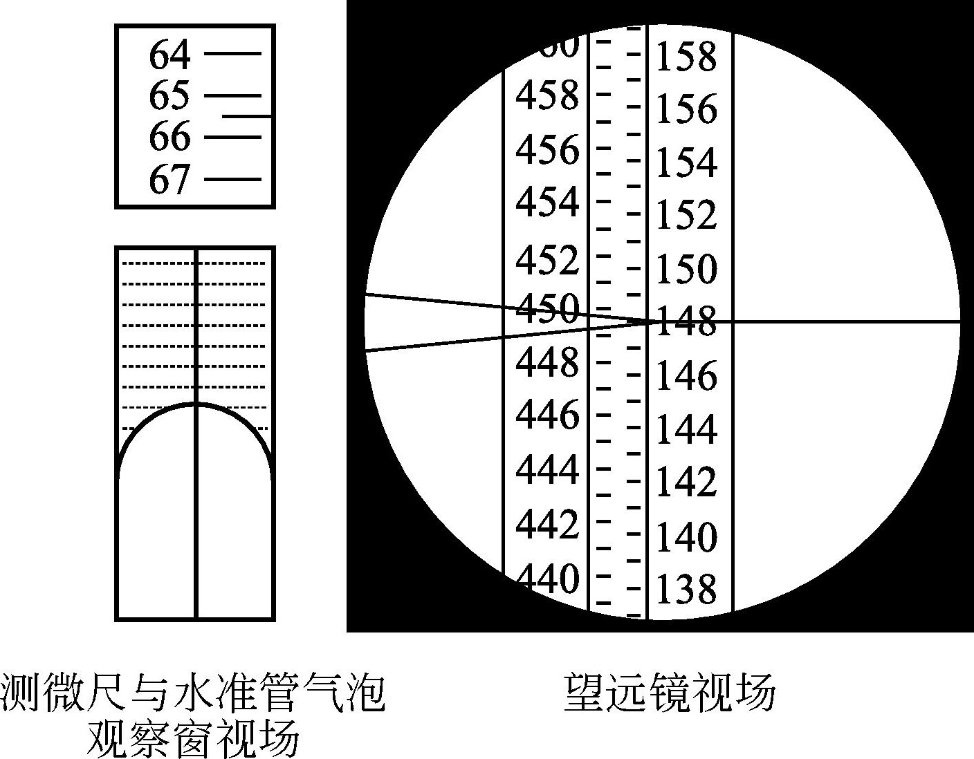 作业时,先转动微倾螺旋,使望远镜视场左侧的符合水准管气泡两端的影像精确符合,此时视线水平。再转动测微螺旋,使十字丝上楔形丝精确夹住整分划,读取该分划读数,图2-41为1.97m,再从目镜右下方的测微尺读数窗内读取测微尺读数,图中为1.50mm。水准尺的全读数等于楔形丝所夹分划线的读数与测微尺之和,即1.97150m,实际读数为全读数的一半,即0.98575m。