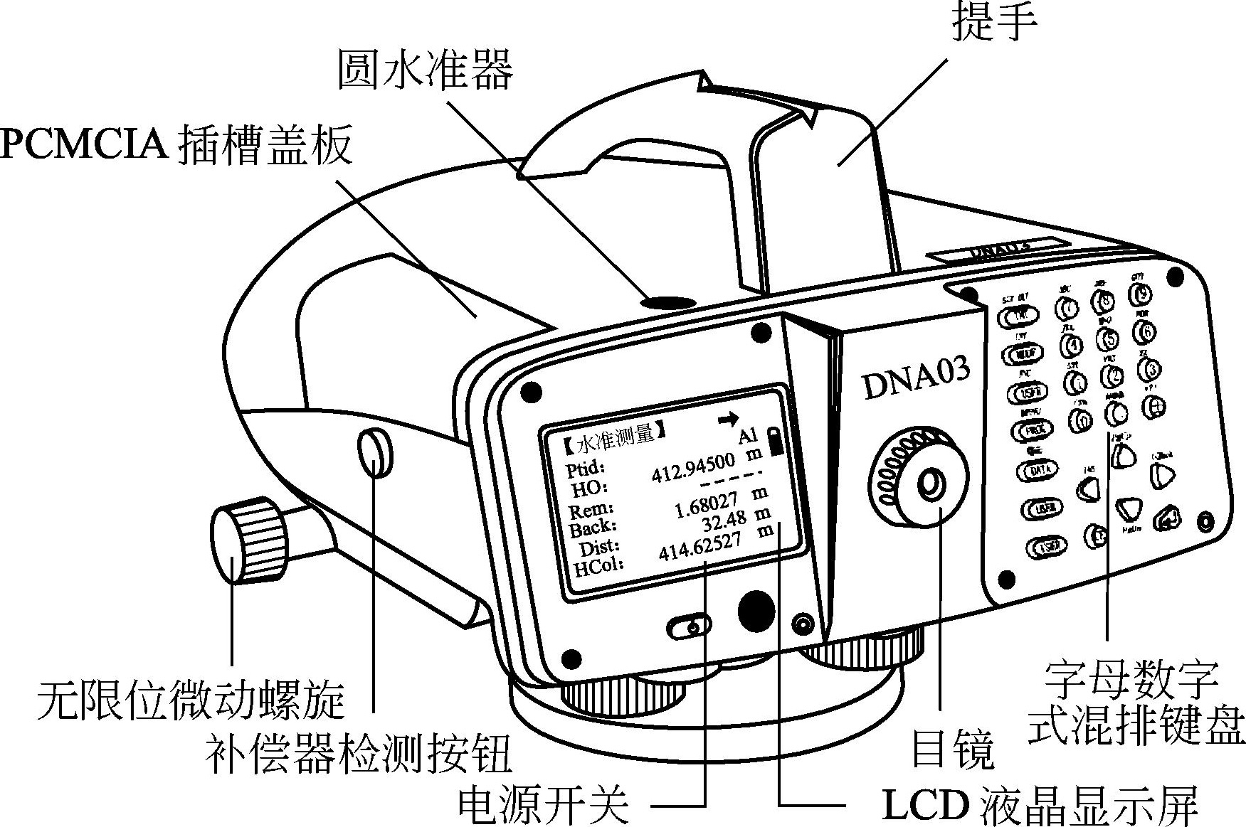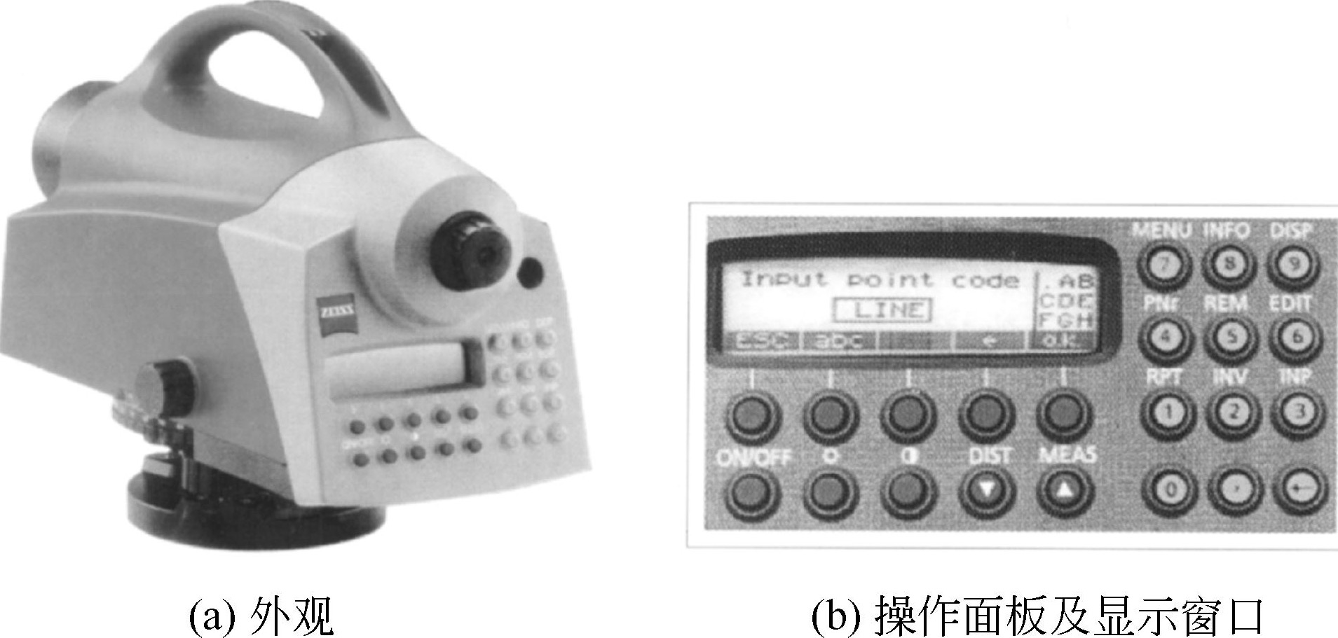 天宝DiNi03电子水准仪是目前世界上精度最高的电子水准仪之一,每千米往返测量高差中误差最高为±0.3mm。它有先进的感光读数系统,感应可见白光即可测量,测量时仅需读取条码尺30cm的范围;配有2M内存的PCMCIA数据存储卡;具有多种水准导线测量模式及平差和高程放样功能,可进行角度、面积和坐标等测量。该电子水准仪由望远镜、补偿器、光敏二极管、圆水准器及脚螺旋等组成。图2-46(a)为DiNi03电子水准仪的外观图,图2-46(b)为该仪器的操作面板及显示窗口。
