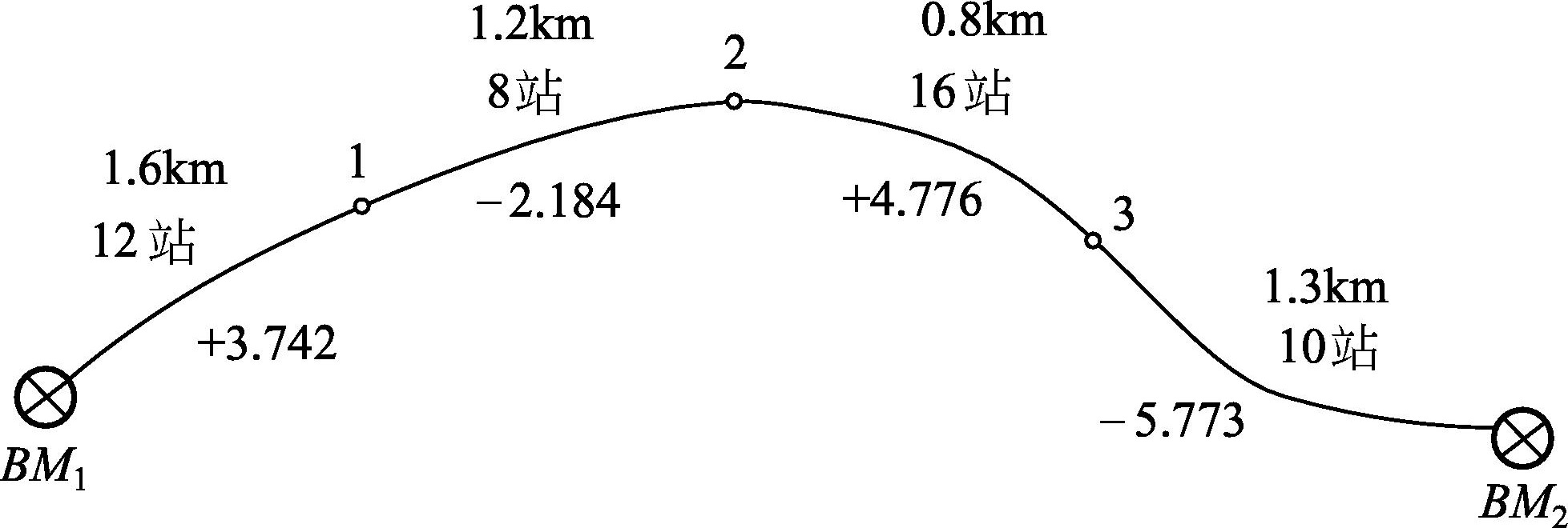 图2-48 附合水准路线的简图及观测成果