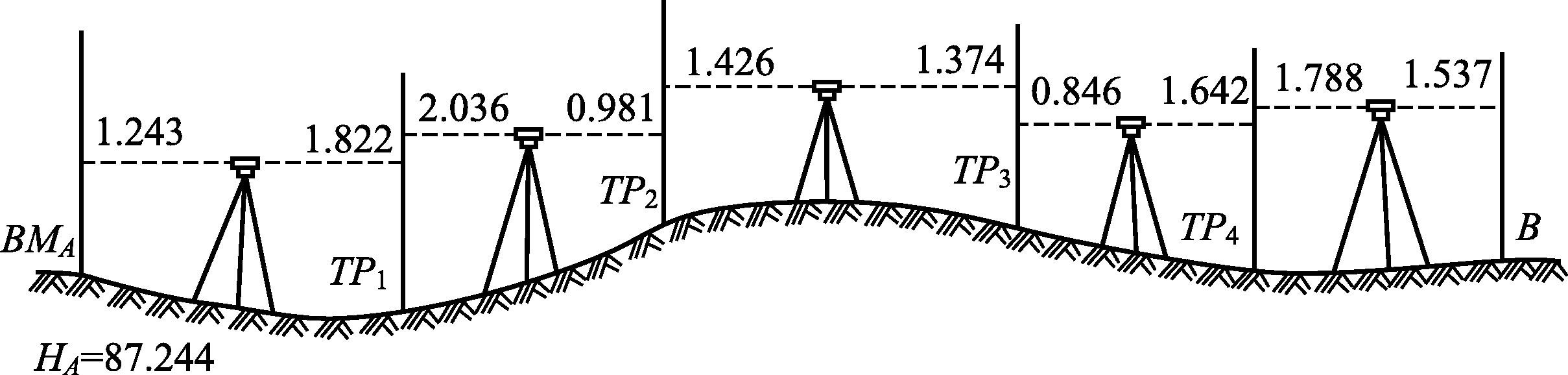13.将图2-47中的水准测量观测数据填入记录手簿(表2-4),计算出各点的高差及 B 点的高程,并检核。