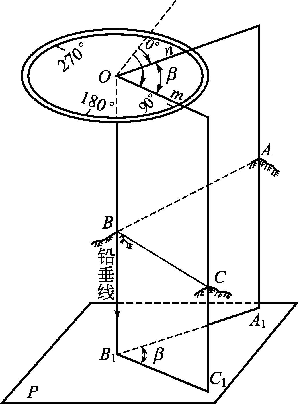 为了测量水平角 β ,可以设想在过 B 点的上方水平地安置一个带有顺时针刻画、注记的圆盘,称为水平度盘,并使其圆心 O 在过 B 点的铅垂线上,直线 BC 、 BA 在水平度盘上的投影为 Om 、 On ;这时,若能读出 Om 、 On 在水平度盘上的读数 m 和 n ,水平角 β 就等于 m 减 n ,用公式表示为