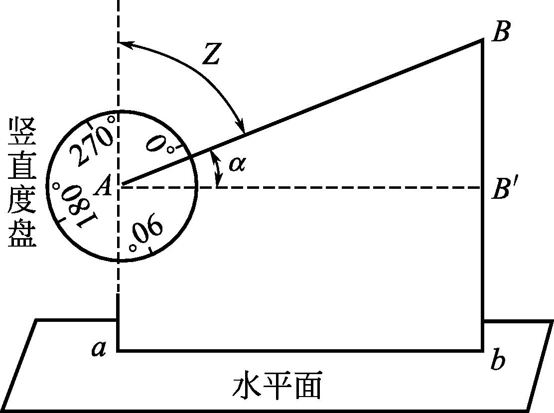 视线与测站点天顶方向之间的夹角称为天顶距。图3-2中以 Z 表示,其数值为0°~180°,均为正值。显然,同一目标的竖直角 α 和天顶距 Z 之间有如下关系