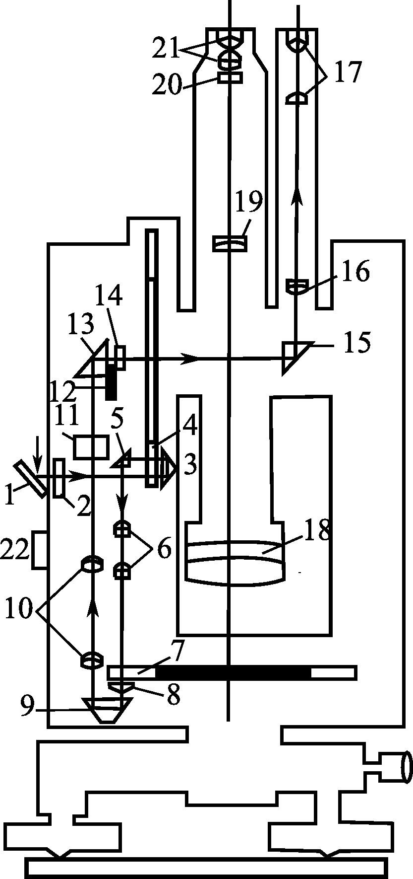 ②竖直度盘光路 进入仪器内部的光线经竖盘照明棱镜3转向180°后透过度盘,带着竖盘刻画注记影像经棱镜5折转90°向上,通过光具组对影像进行一次放大,再经棱镜7转向90°也成像在读数窗场镜的另一块测微尺8上。