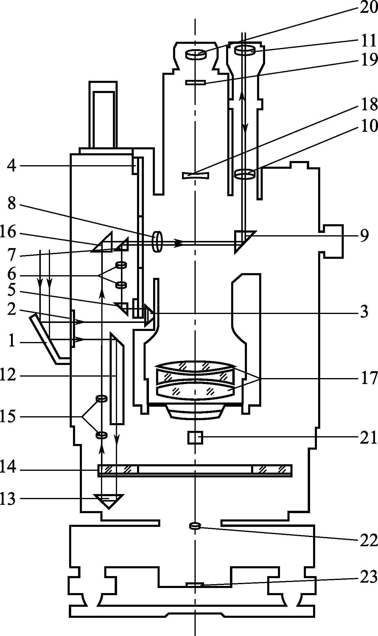 ①水平度盘光路 进入仪器内部的光线经棱镜12转向90°后,经聚光透镜照射在水平度盘无刻画部分,透过度盘经底棱镜13将光线转向180°后折返向上,第二次照射在度盘上有刻画注记的部分,向上透过度盘,带着度盘上不透光的刻划和注记影像,经光具组15对影像进行第一次放大,再经棱镜16转向90°成像在读数窗场镜的测微尺8上。