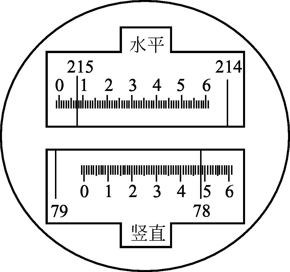 水平和竖直两路光线透过读数窗场镜后,分别带着水平度盘、竖直度盘及两块测微尺的影像,经棱镜9转向90°进入读数显微镜,通过透镜组对影像进行第二次放大,观测时,调节读数显微镜目镜11即可同时清晰地看到水平度盘、竖直度盘及两块测微尺的影像。放大率约为65倍。如图3-6所示。